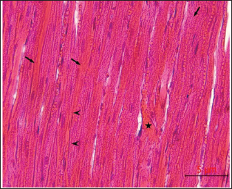 Fig. 6. Histopathological examination of the heart revealed eosinophilic degeneration (arrows) of cardiac muscle fibers, accompanied by atrophy in some fibers (arrowhead), with bleeding between fibers (asterisk), H&E, 40x.scale bar=5µm.