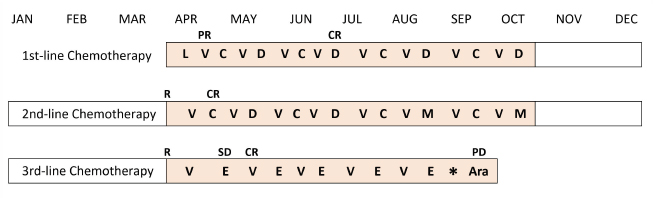 Fig. 1. Treatment schedule and clinical response of the case. L=l-asparaginase; V=vincristine; C=cyclophosphamide; D=doxorubicin; M=mitoxantrone; E=epirubicin; Ara=cytosine arabinoside; R=relapse; PR=partial response; CR=complete response; SD=stable disease; and PD=progressive disease (Vail et al., 2010). The asterisk indicates the time of onset of AICM.