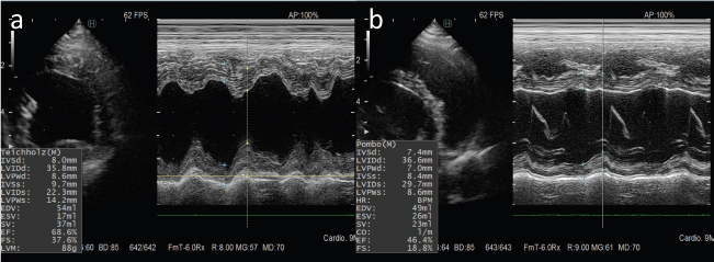 Fig. 2. M-mode echocardiograms of the case. (a): Normal cardiac function was seen in six cycles of doxorubicin administration. (b): A marked reduction in ventricular contractility was observed at 1 week after administration of six cycles of epirubicin.