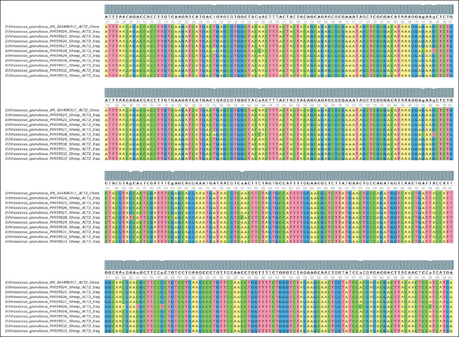 Fig. 3. Multiple sequence alignment of the partial ACT2 gene in E. granulosus shows similarities and differences between the identified sequences in sheep, supporting the sequence identity findings and highlighting minimal variation among the sheep isolates.