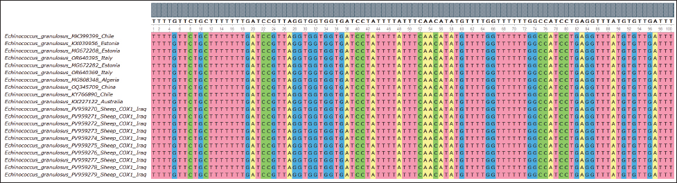 Fig. 6. Multiple sequence alignment of the partial COX1 gene in E. granulosus shows the similarity and differences between the identified sequences in sheep, further confirming the strong genetic consistency among the isolates.