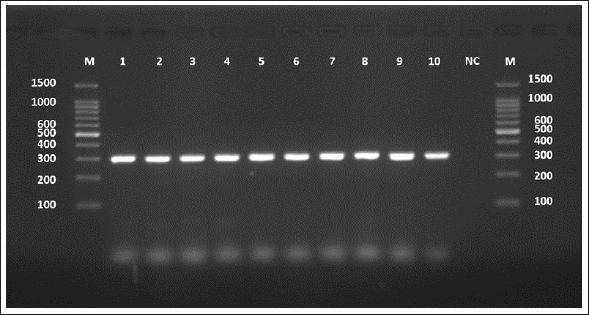 Fig. 7. Agarose gel electrophoresis image (1.5%) shows the amplicons of the CYT gene (size=309 bp) in sheep. NC is the negative control in which H2O was added instead of the template DNA. M is a molecular marker (100–1,500 bp) obtained from GeneDirex (South Korea). Table 4. The NCBI-BLAST homology sequence identity (%) between local E. granulosus targeting the CYT gene in sheep.