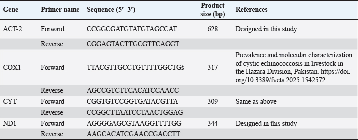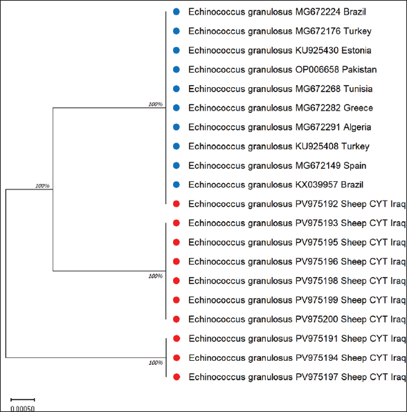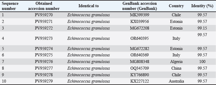 ABSTRACTBackground: Hydatid disease remains a major concern in sheep farming, particularly in endemic areas such as Iraq. Aim: This study aimed to explore the molecular characteristics of Echinococcus granulosus isolated from sheep using multilocus genetic analysis. Methods: Fertile cysts were collected from sheep slaughtered in Diwaniyah and processed for DNA extraction. Four genetic loci—ACT-2, COX1, CYT, and ND1—were amplified by polymerase chain reaction (PCR) and sequenced to evaluate the diversity of the parasite. Results: Each gene yielded fragments of expected lengths, and no contamination was observed in the negative controls. Sequences from sheep isolates were submitted to GenBank, with accession numbers PV959524–PV959533 (ACT-2), PV959270–PV959279 (COX1), PV975191–PV975200 (CYT), and PV975171–PV975180 (ND1). BLAST comparisons revealed identities ranging from 95.6% to 100%, with close matches to isolates from China, Brazil, Estonia, and Turkey. Phylogenetic trees showed clear clustering of local sheep strains with global references, particularly within the G1 lineage. Multiple sequence alignments confirmed a high degree of similarity with minor genetic variation. Conclusion: These results demonstrate the genetic stability of E. granulosus in sheep in southern Iraq and support its inclusion in regional parasite mapping efforts. The data also emphasize the importance of sheep as intermediate hosts contributing to the persistence and spread of this zoonotic parasite. The genetic analysis of E. granulosus from sheep showed close relationships with international strains, reflecting regional transmission and limited sequence divergence. Molecular typing remains essential for the epidemiological control and future vaccine development. Keywords: Alignment, Diagnostic, Liver, Sequencing, Zoonosis. IntroductionCystic echinococcosis (CE) is a disease caused by the larval form of E. granulosus sensu lato (s.l.) (Woolsey and Miller, 2021). This parasite belongs to the tapeworm group. It spreads widely around the world. CE affects both animals and humans. The disease is particularly common in areas where sheep are raised. Sheep often act as intermediate hosts. They get infected when they eat parasite eggs. These eggs hatch and form cysts, mainly in the liver or lungs of sheep. Dogs are the final hosts. They eat infected sheep organs and then pass the eggs in their feces (Manterola et al., 2022). This keeps the infection cycle going. The disease causes significant problems for farmers. Infected animals must be destroyed. This leads to losses in meat production. Farmers also face extra costs for control measures (García-Méndez et al., 2022). In many rural places, such as the Middle East, CE is still common. However, it is often not reported well. Studies using molecular tools have shown that E. granulosus s.l. has different genotypes. The most common species found in sheep is E. granulosus sensu stricto (G1–G3) (Ohiolei et al., 2022). Other types, such as G6 and G7, have also been found in sheep, but they are rare (Hua et al., 2022). Knowing the genotype is essential. It helps in understanding how a disease spreads in a region. Different types may behave differently. Some may cause more harm, affect different animals, or react differently to treatment (Wen et al., 2019; Khademvatan et al., 2019). Research from Europe, Asia, and Africa has shown that sheep strains are genetically similar to those found in other farm animals (Ali et al., 2020; Shams et al., 2022; Casulli et al., 2022a,b). This shows that the parasite easily moves between animals. Nevertheless, differences in parasite types have been found even in the same animal species from different places (Tamarozzi et al., 2020a,b; Borhani et al., 2024). Therefore, it is important to study the parasite locally. Iraq is a country in which such studies are still limited. A good way to study the parasite is through MLG. This method examines more than one gene. It helps to identify differences even within the same genotype. Scientists often use mitochondrial genes such as COX1 and ND1. They also use nuclear genes such as ACT-2 (Aregawi et al., 2024; Gharbi and Giraudoux, 2024). These genes help researchers understand how parasite strains are related. This is useful, especially in areas where the parasite infects many types of animals (Tamarozzi et al., 2020a,b). In Iraq, especially in the south, there are insufficient genetic data about E. granulosus in sheep. This makes it difficult to determine how the parasite is changing or spreading. Conducting more genetic studies on sheep can help. This will improve our understanding of the disease and how it moves between animals (Anvari et al., 2021a,b; Karshima et al., 2022). Sheep are essential in maintaining the parasite cycle. If we do not know which strains are present in sheep, we cannot effectively control the disease (Samei and Khedri, 2025). Good data are needed to make vaccines or deworming programs. Because sheep often live with other animals, they may pass the parasite to others. Studying their role carefully is important. Molecular tools can help us understand how parasites spread between animals and regions (Hua et al., 2022). This study was conducted to provide such information. The genetic types of E. granulosus found in sheep from southern Iraq were examined using PCR and gene sequencing. Materials and MethodsSample collectionFertile hydatid cysts were collected from the liver and lungs of infected sheep during routine postmortem inspection at a slaughter facility. Cysts were microscopically examined to confirm fertility and viability by identifying the presence of protoscoleces and live protoscoleces, respectively (Mokhtaria and Ammar, 2019). Frozen hydatid cysts can replace incineration and sterilize cysts. The germinal layer of each cyst was carefully separated using sterile tools and transferred into labeled Eppendorf tubes. The samples were transported in a cooled c