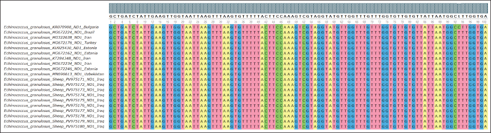 Fig. 12. Multiple sequence alignment of the partial ND1 gene in E. granulosus shows similarities and differences between the identified sequences in sheep, highlighting extremely limited genetic differences, further supporting the conserved nature of this mitochondrial gene in sheep isolates from the region. The phylogenetic trees from our gene sequences clearly grouped the sheep samples with known E. granulosus sensu stricto strains. This means that the parasites isolated from sheep in this study are closely related to standard reference types. Hamad et al. (2025) reported a similar result. They used different genes but found the same pattern in Iraqi sheep. These findings confirm that sheep continue to carry stable parasite strains. The close association between dogs and sheep explains why the parasite remains genetically stable. Larrieu et al. (2019) also highlighted this pathway. They called the dog-sheep link the main driver of the spread of CE. Koziol and Brehm (2015) noted that the parasite does not face strong evolutionary pressure in intermediate hosts. This allows the same strain to persist over time and across regions. Our results agree with these findings. The ND1 and CYT genes we studied showed almost no major changes compared with the global strains. Casulli et al. (2022a,b) also reported that parasite types often cross borders. Therefore, it is normal to find similar strains in different countries (Karim et al., 2018; Yaseen et al., 2020; Janabi, 2020; Janabi, 2021; Ghazi et al., 2024). This shows that molecular methods are strong and can be used in many countries and for different animals. The use of multilocus sequencing confirmed this. This helped us prove the identity and genetic closeness of the local sheep parasites. The ND1 and CYT genes in this study closely matched those in other samples from Eurasia. This means that the parasites in Iraqi sheep belong to the common G1 group. This group is stable and widespread. used similar tools to study Eimeria in sheep. They also found that molecular tests are effective for animal diseases (Sabeeh et al., 2018; Alfatlawi et al., 2021; Janabi, 2021; Klaif et al., 2022). In this study, we used four genes. All of them gave consistent results. This shows that multilocus testing is reliable. This method can also help future efforts to control CE in Iraq (Saied et al., 2022; Qui, 2023; Saied and Hameed, 2023; Maty, 2023; Al-Niaeemi and Dawood, 2023; Al-Taee et al., 2023; Mizory and Altaee, 2023; Hassan et al., 2024; Rahawi et al., 2024; Al-Taee, 2024; Al-Taee et al., 2024; Nofiu and Baharudin, 2024; Al-Kattan and Al-Bassam, 2024). ConclusionThis study showed that sheep in Diwaniyah, Iraq, are infected with E. granulosus strains belonging to the G1 genotype. This is the same type found in many countries. We studied four genes—ACT-2, COX1, CYT, and ND1. All the results confirmed that sheep carry a stable version of the parasite. Very few genetic differences were observed. This proves that sheep are important in the parasite life cycle. The strong correlation with global strains also shows that CE in Iraq is linked to wider international patterns. Molecular tools such as those we used are helpful in tracking and understanding these parasites. They are useful for disease control and future surveillance. Acknowledgment The authors thank the College of Veterinary Medicine at the University of Al-Qadisiyah for their continuous support. Their assistance with laboratory work and guidance throughout this research was greatly appreciated. Funding The authors have self-funded the study. No external funding source is available. Authors’ contributions All authors have participated in the study. Conflict of interest The authors have no conflicts of interest to declare. Data availability Data are available when requested by the corresponding author. ReferencesAbd-Alhassen, J.K., Janabi, A.H.D. and Aboktifa, M.A. 2021. Antioxidant and antimicrobial evaluation of lycopene isolated from watermelon. Biochem. Cell. Arch. 21, 2905–2910. Alfatlawi, M.A., Jasim, A.A., Jarad, N.E. and Khlaif, S.F. 2021. Clinical and molecular identification of Theileria annulata strains in calves in Al-Diwaniyah. Iraqi J. Vet. Sci. 35(1), 115–119; doi:10.33899/ijvs.2020.126429 Ali, R., Khan, S., Khan, M., Adnan, M., Ali, I., Khan, T.A., Haleem, S., Rooman, M., Norin, S. and Khan, S.N. 2020. Medicinal plants used against Echinococcus granulosus: a systematic review. PLos One. 15(10), 240456;doi:10.1371/journal.pone.0240456 Al-Kattan, H.H. and Al-Bassam, N.S. 2024. Sweet bean and roselle seeds improve growth of common carp. Mesopotamia J. Agric. 52(2), 58–67;doi:10.33899/mja.2024.146824.1374 Al-Niaeemi, B.H. and Dawood, M.H. 2023. Bioaccumulation of heavy metals in Bothriocephalus acheilognathi and Cyprinus carpio. Iraqi J. Vet. Sci. 37(4), 899–905;doi:10.33899/ijvs.2023.137615.2715 Al-Taee, N.T., Mohammad, M.A. and Abdul-Majeed, A.F. 2024. Effect of replacing animal protein with duckweed on carp growth performance. Mesopotamia. J. Agric. 52(3), 22–36; doi:10.33899/mja.2024.145298.1316 Al-Taee, S.K. 2024. Immunohistochemical and semiquantitative analysis of carp gills exposed to sodium thiosulfate. Iraqi. J. Vet. Sci. 38(1), 191–198; doi:10.33899/ijvs.2023.140746.3086 Al-Taee, S.K., Al-Zubaidy, M.H., Mustafa, K.A. and Ismail, H.K. 2023. Role of Saccharomyces cerevisiae in alleviating copper sulfate toxicity in Cyprinus carpio. Iraqi J. Vet. Sci. 37(3), 573–580;doi:10.33899/ijvs.2023.135148.2449 Anvari, D., Pourmalek, N., Rezaei, S., Fotovati, A., Hosseini, S.A., Daryani, A., Spotin, A., Sarvi, S., Hosseini, M., Narouei, M.R., Kalkali, M., Pendar, F. and Gholami, S. 2021. Hydatidosis in camels: global status and genetic data. Parasitology 148(3), 259–273; doi:10.1017/S0031182020001705 Anvari, D., Rezaei, F., Ashouri, A., Rezaei, S., Majidiani, H., Pagheh, A.S., Rezaei, F., Shariatzadeh, S.A., Fotovati, A., Siyadatpanah, A., Gholami, S. and Ahmadpour, E. 202
