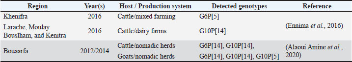 AbstractGroup A rotavirus commonly infects cattle and results in gastrointestinal disorders that are responsible for heavy losses among these animals and within the livestock industry in general. In Morocco, the G10P[14] and G6P[5] genotypes are frequently observed; however, limited data contribute to restricted vaccine choice and disease control. Preventive measures include effective colostrum management practices, hygiene, and vaccination of pregnant cows to pass on passive immunity to newborn calves. Nevertheless, the effectiveness of vaccines in Morocco has not been ascertained because there has been no proper tracking of local variants and their spread. This narrative literature review presents an updated insight into the bovine rotavirus scenario in Morocco and its impact on animal health and the cattle industry. Epidemiological data on circulating genotypes and vaccine performance remain limited and fragmented at the national level, constraining evidence-based vaccine selection and control strategies. Therefore, epidemiological investigations are recommended to identify circulating strains, along with laboratory and field studies assessing vaccine effectiveness, in addition to improved management practices and farmer education. Therefore, using these evidence-based approaches, productivity losses and the vulnerability of the Moroccan livestock industry can be minimized. This paper goes a long way in demonstrating the need for cross-disciplinary work between researchers, veterinarians, and policymakers that will help translate the findings into practical interventions in fields that not only preserve the health of animals but also the farmers’ income in Morocco’s diverse zones. Keywords: Bovine rotavirus, Neonatal calf diarrhea, G and P genotypes, Vaccine efficacy, Morocco. IntroductionRotaviruses are known to be responsible for severe diarrhea in infants and children, as well as in young mammals and avians all over the world. Bovine rotavirus (BRV) is considered to be the leading causative agent of calf diarrhea on a worldwide basis. Among all predisposing causes of diarrhea, BRV is unique in its capacity to account for 62.5% (Uddin Ahmed et al., 2022). Rotavirus diarrhea in calves is highly infectious but short-lived. Factors such as age, immunity, virus dose, other infections, and stress affect its severity. Serious complications include kidney failure and electrolyte imbalance, which may result in dehydration and death (Gichile 2022). Rotavirus is a non-enveloped virus with an Ribonucleic Acid (RNA) genome, which is segmented into 11 parts that encode both structural and non-structural proteins (Caddy et al., 2021). Among the different rotavirus groups, group A rotavirus (RVA) is the most relevant in cattle and is categorized in the genus rotavirus in the family Sedoreoviridae. They are grouped based on the antigenic and genetic differences in the outer capsid antigens, VP7 and VP4, as well as the inner capsid protein, VP6. Neutralizing antibodies target two outer capsid proteins, VP4 and VP7 (Dhama et al., 2009; Uddin Ahmed et al., 2022). The transmission of RVA between different host species, together with genetic reassortment, recombination, and point mutations, drives viral diversity and the emergence of new genotypes (Desselberger, 2014; Dóró et al., 2015). In Morocco, RVA transmission is influenced by specific livestock management practices, particularly in nomadic regions such as Bouaarfa, where close contact between humans and multiple animal species favors interspecies transmission and genetic reassortment (Alaoui Amine et al., 2020). The control of BRV relies primarily on preventive measures, including adequate colostrum intake, hygiene management, and vaccination of pregnant cows to ensure passive immunity in calves (Corl et al., 2008; Izzo et al., 2011; Gichile, 2022). However, in Morocco, challenges remain regarding vaccine strain selection and the limited availability of field-based data evaluating vaccine effectiveness under local conditions (Saif and Fernandez, 1996; Lopez and Heinrichs, 2022). This narrative literature review aims to summarize the current information regarding BRV in Morocco and its effects on health and the economy, given the limited epidemiological data available at the national level. We will also discuss the possible ways of preventing the disease with a focus on selecting the appropriate vaccine to be administered to the Moroccan cattle population. The following recommendations were made to strengthen disease control and minimize its impacts on cattle farming in Morocco. Literature search strategyThis narrative review is based on a literature search conducted between 1970 and 2025 using PubMed, Google Scholar, and Moroccan institutional databases. The keywords were related to the structure and classification of rotavirus, genetic diversification, BRV, epidemiology, genotype distribution, clinical manifestations, diagnostic techniques, maternal immunity, prophylactic and vaccination strategies, and zoonotic transmission. Eligible sources included peer-reviewed original research and relevant review articles; official regulatory and normative documents were also consulted. Studies focusing exclusively on human rotavirus without comparative relevance and those addressing aspects outside the defined thematic scope were excluded. Older studies were retained when they provided essential baseline data, particularly for Morocco, where surveillance data remain limited. More recent studies were used preferentially to discuss current classification, genotype dynamics, and vaccination strategies, while international data were included for comparative and contextual purposes. Group A rotavirusGroup A rotaviruses belong to the family Sedoreoviridae, order Reoviridae, and genus Rotavirus. Rotaviruses are icosahedral and non-enveloped viruses with 11 segments of double-stranded RNA (16–21 kbp) that are well protected by an inner and outer capsid la