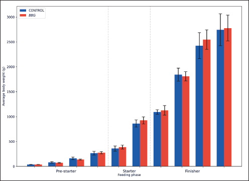 Fig. 1. Body weight (BW) performance. The model Yi=μ + Ti + εi was used, where μ=overall average, Ti=treatment effect (i=Control, BBG); and εi=experimental error. Mortality data, being binomial, were analyzed using a chi-square (χ2). All differences were considered statistically significant at p < 0.05. For biochemical data (Table 4), a descriptive longitudinal analysis was performed to visualize hematological fluctuation over time through graphical representations (Figs. 2–6).
