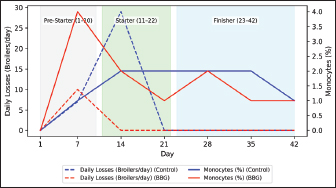Fig. 6. Variation in the monocyte percentage and daily mortality in broilers. Table 4. Serum biochemistry parameters of broiler chickens throughout the experimental period