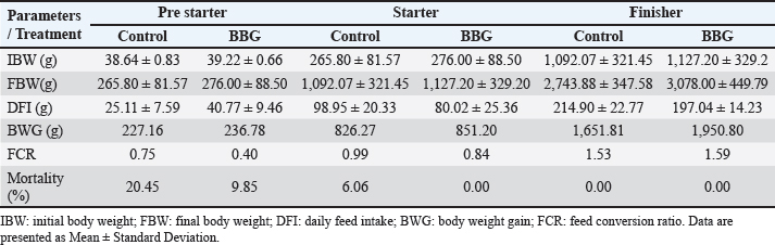 Ethical approvalInstitutional and national guidelines for the care and use of laboratory animals were followed in compliance with ethical standards, following the guidelines of the Bioethics Committee for Animal Research of the Venezuelan Institute for Scientific Research (COBIANIM 2025; May 13, 2025). ResultsAnalysis of diet and water qualityThe bromatological analysis of the diets developed for the three growth phases (pre-starter, starter, and finisher) (Table 1) confirmed that all nutritional levels were comparable between treatments. This consistency ensured that the diets were isoproteic and isoenergetic, meeting the specific nutritional requirements for each developmental stage. Table 2 shows the physical and chemical parameters of the water supplied to the broilers. Noncompliance with regulatory standards was identified for free residual chlorine, pH, and nitrate. Specifically, the absence of residual chlorine (0 mg/l) and the high nitrate concentration (34.53 mg/l NO3) indicate that the drinking water deviates considerably from the optimal values for poultry farming. Productive performanceTable 3 and Figure 1 summarize the production parameters evaluated throughout the three growth phases (Pre-starter, Starter, and Finisher) for both treatments (Control and BBG). In the pre-starter phase, the IBW was 38.64 ± 0.83 g for the Control and 39.22 ± 0.66 g for the BBG treatment, indicating no differences in the initial weight between the treatments. At the end of this phase, the FBW of the BBG treatment was higher (276.00 ± 88.50 g) compared to the Control (265.80 ± 81.57 g). The DFI was 25.11 ± 7.59 g for the Control and 40.77 ± 9.46 g for the BBG, while the BWG was 227.16 g and 236.78 g. The FCR was 0.75 and 0.40 for the control and BBG treatments, respectively. Mortality was notably higher in the control treatment (20.45%) than in the BBG treatment (9.85%), suggesting an increase in field challenge that affected both treatments, although the control showed a disproportionately greater impact. No significant differences were observed between treatments during this phase (p > 0.05). During the starter phase, the IBW was 265.80 ± 81.57 g for the Control and 276.00 ± 88.50 g for BBG, maintaining the trend of a higher FBW in the BBG treatment (1,127.20 ± 329.2 g) compared to the Control (1,092.07 ± 321.45 g). The DFI was 98.95 ± 20.33 g for the Control and 80.02 ± 25.36 g for the BBG, while the BWG was 826.27 g and 851.20 g. The FCR was 0.99 for the control and 0.84 for the BBG treatment, indicating better feed efficiency in the latter. Mortality in this phase was absent in the BBG treatment (0.00%) compared with 6.06% in the control group. Statistical analysis indicated no significant differences during this phase (p >0.05). In the finisher phase, the IBW was 1,092.07 ± 321.45 g for the Control and 1,127.20 ± 329.2 g for the BBG. At the end of the study (day 42), the FBW of the BBG treatment reached 3,078.00 ± 449.79 g, surpassing that of the control treatment, which recorded 2,743.88 ± 347.58 g. The DFI in this phase was 214.90 ± 22.77 g for the Control and 197.04 ± 14.23 g for the BBG, resulting in a BWG of 1,651.81 g and 1,950.80 g, respectively. The FCR was 1.53 for the control group and 1.59 for the BBG group. No mortality was observed in either treatment group during this phase. Statistical analysis showed no significant differences between treatments (p > 0.05). Overall, the treatment with BBG inclusion consistently showed higher FBW and BWG, as well as improved FCR during the pre-start (0.40 vs. 0.75) and starter phases (0.84 vs. 0.99), although the latter was slightly higher in the finisher phase (1.59 vs. 1.53). Notably, mortality was significantly lower in the early phase of BBG treatment, suggesting a protective effect against initial environmental challenges. Hematological profileIn the hematological analysis, the blood count results for broilers in both control and BBG treatments showed variations compared with the established reference values. Reference values: Leukocytes: 4,000–40,000 (cells/µl or mm³), Segmented cells: 20–50 (%), Lymphocytes: 45–75 (%), Eosinophils: 0–2 (%), Monocytes: 2–10 (%). In the Control treatment, leukocytes consistently exceeded the reference range at most sampling points, with peak values of 90,871 cells/μl (day 14), 59,583 cells/μl (day 21), and 45,117 cells/μl (day 42). This indicates a marked leukocytosis, suggesting chronic inflammation or an infectious process (Fig. 2). Segmented cells (heterophils) were above the reference range on days 7 (51%) and 35 (55%) (Fig. 3). Lymphocytes remained within the reference range, except on day 35 (42%) (Fig. 4). Eosinophils remained within the range throughout the study (Fig. 5), whereas monocytes were below the reference range on days 7 (1%) and 42 (1%) (Fig. 6). In the BBG treatment, leukocytes exceeded the reference range at all sampling points, with values ranging from 24,500 cells/μl (day 28) to 66,369 cells/μl (day 14) (Fig. 2). Segmented cells remained within the range, except on days 14 (52%), 21 (55%), and 35 (53%), when they were slightly above the upper limit (Fig. 3). Lymphocytes were within the reference range at all sampling points (Fig. 4), indicating a more stable immune response compared with the control. Eosinophils were within the range throughout the study (Fig. 5), whereas monocytes were below the reference range on days 21, 35, and 42 (1%) (Fig. 6). Both treatments showed markedly elevated leukocyte levels relative to the reference values throughout the study. Although segmented cell and lymphocyte trends varied, they remained mostly within or near the established ranges for both treatments. Blood biochemistryThe results of blood biochemistry analyses for broiler chickens in the control and BBG treatments are detailed in Table 4. Various alterations were observed compared with the established reference values. In the control group, blood glucose l