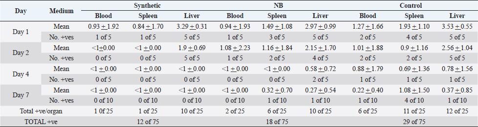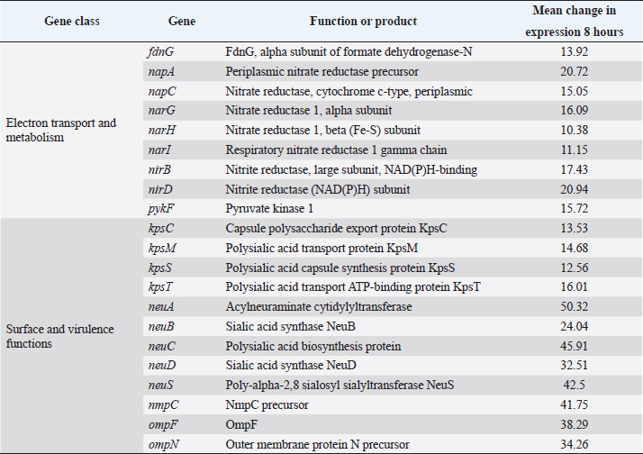 None of the birds showed any signs of illness. Tissue samples from a proportion of the birds from both the unvaccinated birds and those which had been vaccinated with the bacterin prepared from NB remained infected while the birds vaccinated with the bacterin cultured in the synthetic SMM-1 medium had cleared the challenge bacteria from their tissues almost by day 4 post-challenge. A comparison of the number of samples from which the challenge strain was isolated revealed a statistically significant difference between control unvaccinated and the NB vaccine group (χ2 =3.75, p =0.05), and between the control and synthetic medium group (χ2 =8.45, p =<0.01) but no statistically significant difference between the nutrient both and synthetic medium groups (χ2 =1.01, p =0.4). The differences were more marked for the blood and spleen samples than for the bacterial counts in the liver. Compared with the control group the level of significance for the synthetic medium group was higher than for the NB bacterin group. DiscussionVaccination is more desirable than chemotherapy to control APEC. Early protection mediated by high titre circulating specific antibodies may be important as indicated by the protection against parenteral avian Salmonella infections using the commercial Salenvac vaccine which stimulates high titer antibodies (Woodward et al., 2002). That high titer antibody correlates to some extent with protection is indicated by the fact that passively transferred antibody may protect against challenge with the homologous strain (Arp, 1980; Bolin and Jensen, 1987; Kariyawasam e t al., 2004). The ultimate purpose of this analysis was to develop a synthetic medium reproducing these conditions as near as possible. For this reason, a full analysis of gene expression was not carried out by COGs gene classes. They were grouped according to genes likely to affect intracellular survival, response to stress, and virulence gene expression. Our microarray studies here were designed to identify genes likely to affect intra-cellular survival, response to stress, and virulence gene expression. Although detailed analyses of gene expression were not carried out it was clear that the experiments showed that E. coli O78:K80 when established within avian macrophages, show patterns of physiology that are different from growth in liquid RPMI medium. These changes include a trend toward respiration with oxygen as a terminal electron acceptor indicating that oxygen was available as the preferred electron acceptor. There were indications from individual genes (gntR, gmd, glcC, yieL, and dcuB) that different carbohydrates (gluconate, mannose, glycolate, xylan, and dicarboxylate acids, respectively) may have been used but the picture was not clear from the small number of genes involved in each case. Table 3. The effect of vaccination with bacterins produced by culture in NB or SMM-1 on the numbers of E. coli F135 in the tissues of chickens challenged intravenously. Log10 (± SD) of E. coli F135 in the blood, liver or spleen together with the number of chickens in each group from which the challenge strain was isolated.