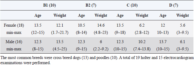 AbstractBackground: Myxomatous mitral valve degeneration (MMVD) is the most common heart disease affecting small dogs, it reduces cardiac output resulting in compensatory adaptation of the autonomic nervous system. Chronically, it leads to reduced heart rate variability (HRV) which is an accurate marker for autonomic balance. More than two decades ago in human medicine an indicator of autonomic balance that happens after a premature ventricular beat, it was described as heart rate turbulence (HRT). In humans with ischemic heart disease, the absence of HRT has proven to be a more accurate and an independent indicator of mortality than known HRV parameters. Currently, there are very few studies of HRT in dogs and it is still not tested in small dogs within different stages of myxomatous mitral valve disease. Aim: The aim of this study was to assess the HRT indicators, onset and slope, in small dogs with myxomatous mitral valve disease and to statistically test it. Methods: Dogs under 25 kg had electrocardiogram and echocardiography performed and, in some patients, holter monitoring was carried out. Data were divided into groups B1, B2, C, and D for mean comparison with analysis of variance and Tukey test. In addition, receiver operating characteristic (ROC) curve for differentiating among symptomatic and asymptomatic dogs and for differentiating between remodeled and non-remodeled hearts. The Pearson was executed after correlations of turbulence onset (TO) and turbulence slope (TS) with commonly used echocardiographic parameters. Results: Variance analyses held significant differences in TO and TS between stages B1 from stages C and D, while B2 held similarity to the other groups. In the receiver operating curve was found a very good area under the curve for differentiating among symptomatic and asymptomatic dogs and remodeled and non-remodeled dogs. Few echocardiography parameters held weak correlation with TO while others held weak to moderate correlation with TS. Conclusion: In dogs with MMVD and without other diseases, HRT is a feasible indicator for autonomic balance. Our result suggests HRT changes as the MMVD progresses and congestive heart failure is present. More studies with HRT are needed. The number of ventricular premature contractions (VPCs) may be the strongest limitation for the technique. Keywords: Baroreflex, Autonomic balance, Heart rate variability, Turbulence slope, Turbulence onset. IntroductionIn human medicine, a baroreflex indicator is heart rate turbulence (HRT). This demonstrates the response of the cardiac cycle after a premature ventricular beat interrupts sinus rhythm. This non-invasive method stratifies the risk of death and proved to be a strong and independent indicator in man with results better than heart rate variability (HRV) (Schmidt et al., 1999). The HRT is considered to be a biphasic indicator, starting with the turbulence onset (TO), defined as the initial or the acceleration phase and the turbulence slope (TS), considered the terminal or deceleration phase. Intrapatient variability may occur depending on coupling interval time, and heart rate (Bauer et al., 2008). In people with mitral valve prolapse HRT was statistically different from normal subjects, while HRV showed no difference (Gunduz et al., 2006). When divided by the New York Heart Association scale classes I and II had a significantly higher HRT slope than patients in class III (Davies et al., 2001). In dogs myxomatous mitral valve degeneration (MMVD) also known as endocardiosis accounts for 75% of all cardiovascular diseases in dogs under 25 kg and is the heart disease with the highest morbidity and mortality. Clinical signs are generally seen >7 years of age. The mitral degeneration leads to regurgitation and reduced cardiac pumping ability causing volume overload of the left atrium and ventricle (Borgarelli et al., 2008; Fox, 2012). The objective of the present study was to assess and compared the HRT in dogs with myxomatous mitral valve disease at stages B1, B2, C, and D, to calculate it sensitivity and sensibility through receiver operator characteristic (ROC) analyses and to check for correlations with commonly used echocardiographic parameters. Materials and MethodsThe study was conducted at the Veterinary Hospital of Universidade Federal do Paraná. The data collection was designed to gather only information of male and female dogs under 25 kg presenting a mitral valve regurgitation due to mitral valve myxomatous degeneration in stages B1, B2, C, and D. The retrospective part of the study was done with data of 15 dogs while for the prospective analysis 18 dogs were accepted. The total number of dogs enrolled in groups B1, B2, C and D were 10, 7, 10 and 7 respectively, in a total of 34 subjects, 18 females and 16 males. The most common breeds were cross breed dogs (13% or 31%) and poodles (10% or 24%). A total of 19 holter and 15 electrocardiogram examinations were performed (Table 1). For all patients, electrocardiography, echocardiography, creatinine were available, some patients also had exams of seric cACTH or T4, those with diagnosed hyperadrenocorticism or hypothyroidism were not accepted. Retrospective patients had no holter data available, thus only their electrocardiography record was used for the analyses and only prospective patients had holter carried out. Animals in stages B2, C, and D were medicated according to American college of veterinary internal medicine (ACVIM) guidelines (Keene et al., 2019). If the prospective dogs met all the inclusion criteria the owners were invited to participate in the study by 24 hours holter monitoring of the dog. In the electrocardiography and holter if a sinus rhythm, sinus arrhythmia or sinus tachycardia was the main rhythm and at least one ventricular premature contraction (VPC) was present the patient was accepted for HRT calculation. Only dogs with maximal creatinine seric level of 1.4 mg/dl were considered having normal renal f