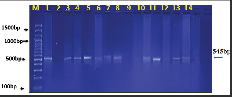 Fig. 1. Ethidium bromide-stained agarose gel electrophoresis of 545 bp of JSRV env gene fragment amplified from OPA-infected sheep. (Lines 1–14 are positive samples, expect 2, 9, 10, and 12 were negative.) Table 1. Clinical signs of JSRV-infected sheep according to PCR results.