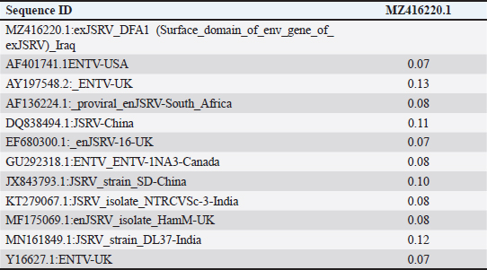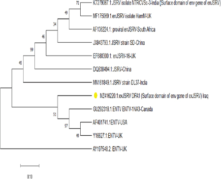 Fig. 2. Phylogenetic tree analysis of env region sequence in the local Iraqi isolate of JSRV of sheep; total genetic changes, 0.010%. Table 2. Multiple sequence alignment analysis of the homogeneity of substitution patterns among the Iraqi JSRV based on the env gene strain (partial region) sequence with various global JSRV and ANDV sequences from sheep and goat.