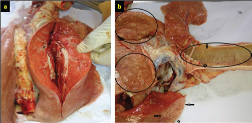 There was a significant association between JSRV infection and the herd size groups (χ2=0.397; p < 0.01). This study shows the correlation between the size of the herd and chance of animal infectivity, in ≤50 animals step up to ≥200 animals herd size, with a significant increase in the proportion of infected animals and an increase in herd size. Based on the χ2 test (Table 3), it was found that in herd size more than 200 heads, the probability of JSRV infection was 8 (12.30%) times higher than expected. In necropsied and slaughtered animals, gross examinations of lungs demonstrated and found that the dorsal region of the caudal lobes was the most affected region. The pathological changes were areas of diffuse consolidation and well-identifiable nodules, with many different sizes of white nodules forming cancer masses. Infected lungs were also heavier and larger when compared with healthy lungs. Cut sections of lungs showed a pale tint, a rubber consistency, and the impression of ribs on the lungs was visible, as well as fluid filling the thoracic cavity (Fig. 3a and b). On the other hand, cut sections of the consolidated area revealed mucus secretions and frothy fluids from the tumor lesions and bronchioles (Fig. 4a–c).