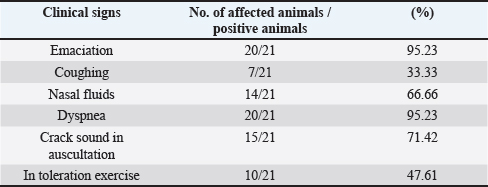 AbstractBackground: Ovine pulmonary adenocarcinoma (OPA), caused by Jaagsiekte sheep retrovirus (JSRV), is a contagious neoplastic disease in sheep characterized by chronic respiratory signs, inducing the transformation of secretory epithelial cells of the distal respiratory tract. Aims: To perform clinical, epidemiological, and molecular studies with evaluation of some predisposing factors at the herd level of OPA infection in sheep in Al-Qadisiyah Province, Iraq. Methods: The first step of the study was undertaken to evaluate the clinical cases of OPA in naturally infected sheep and correlation with observing respiratory signs. Seventy-five sheep with chronic respiratory signs were examined clinically, and by molecular and sequences analysis. The second step was the epidemiological part that was carried out on 195 randomly selected animals from 30 flocks, with the prevalence rate based on PCR; sex, age, and size of flocks were assessed, as well as macroscopic and microscopic features of the neoplastic lung. Deep nasal swabs and nasal secretion were collected from all animals. RNA extraction and RT-PCR were also carried out. Results: The results showed that 12 (16%) samples were positive for OPA, based on env gene-specific primers. Nucleotide sequences of partial 545 bp of the env gene showed (0.07–0.12) variations from global strains presented in the NCBI database. The prevalence rate of OPA was 21/195 (10.76%) with PCR. The epidemiological factors analysis showed that there was no effect of sex and herd size on the prevalence rates (p ≥ 0.01), whereas age was significantly affected and the age of 2–4 years was more susceptible (p ≥ 0.01). Gross and microscopic examinations were discussed with the confirmation of an OPA infection. Conclusion: The current study provides useful data about the clinical and epidemiological features of JSRV that is circulating in sheep of Iraq, and concludes that epidemiological studies and disease control may require multi-diagnostic assays. Keywords: Adenocarcinoma, OPA, Ovine, Pulmonary, Iraq. IntroductionOvine pulmonary adenocarcinoma (OPA) is a contagious neoplastic disease in sheep characterized by chronic respiratory symptoms and caused by the Jaagsiekte sheep retrovirus (JSRV), which causes secretory epithelial cells of the distal respiratory tract to change (Karagianni et al., 2019). The disease is transmitted through aerosols, which are the primary horizontal pathway for spreading the virus during inhalation of infectious aerosols; however, vertical transmission from the dams to their lambs via colostrum and milk were reported (Grego et al., 2008). The disease is widespread in most regions with large sheep populations and can be found in sheep-raising countries including Europe, Africa, Asia, and America (Quintas et al., 2021). Clinically, the disease is marked by progressive respiratory indications such as difficulty breathing, especially after exercise, emaciation, and signs of pneumonia that do not respond to antibiotic treatment (Shi et al., 2021). Progressive cases that cause neoplastic pulmonary lesions in infected sheep, with high rates of infection and death, result in a highly significant economic problem for sheep farmers in many countries (De las et al., 2021). The diagnosis of infected sheep and estimates of the prevalence of JSRV is mostly dependent on postmortem examination of the lungs, which is supplemented by clinical indicators and histopathology, particularly in advanced stages of the affected lung (Radad and Khalil, 2014; Lee et al., 2019). Where there are no detectable JSRV proteins outside the tumor and no circulating JSRV-specific antibodies during the preclinical stage, it is more difficult to identify infected animals (Lee et al., 2019; Ortin et al., 2019). The PCR) tests are informative for epidemiological studies and for identifying infected flocks (Voigt et al., 2007). There are very few studies concerning OPA in Iraq. Recently, Al-Husseiny et al. (2020) identified the OPA disease in Iraq. This study was designed to obtain the clinical, molecular, and histopathological investigations, as well as some epidemiological factors of OPA infection, to evaluate the genetic diversity of JSRV in Iraq. Material and MethodsSamplesThe first part of the study is based on the history of chronic respiratory infections, clinical symptoms and examination, including the positivity of the wheal-barrow test. A total number of 75 samples were obtained from 75 sheep suspected with OPA. These samples were tested using PCR for virus detection, sequencing, and phylogenetic analysis. In addition, gross and histopathological examinations of lung were done. The second part included the collection of 195 sheep samples of different ages (animals were allocated by age to three categories for further analysis: ≥ 2 years, 2–4 years, and ≤4 years) from 30 flock in a random model to evaluate the prevalence rate, and effect of sex, age, and flock size on infection rates. RNA ExtractionNasal swabs and nasal secretion were diluted with 2 ml phosphate buffer saline and filtered through 0.22 Millipore filter; then viral RNA was extracted using the RNA extraction kit (AccuZolTM RNA extraction kit Bioneer, Korea) following the manufacturer’s instructions. The extracted RNA samples were verified using Nanodrop spectrophotometer before being stored at −80°C until testing with the PCR. cDNA synthesisAccording to the manufacturer’s instructions, one script cDNA Synthesis SuperMix (Abm/Canada,) extracted RNA was transformed to synthesis cDNA, which was then used as a template in RT-PCR tests. PCR amplificationSpecific primers of the env gene were utilized; the forward primer sequence of the env gene was 5ʹ-GACCCCTCGACATTCCGTTT-3ʹ (6,222–6,241) and the reverse primer was 5ʹ-CAGCTATTTCAACGGGCAGC-3ʹ (6,757–6,777). The extracted RNA and cDNA were used as a template to identify JSRV by single PCR. One step RT-PCR Premix kit (INtRON Biotechnolo