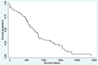 Fig. 2. Kaplan–Meier survival curve of the study population with a diagnosis of HCC. Survival analysis for long-term outcomeSurvival curves were generated and evaluated to assess the effect of variables on long-term outcome (Fig. 3a–f). There was no significant difference identified in survival curves for patients undergoing definitive surgical resection for HCC (MST=695 days, CI=519–844) versus biopsy (MST=747 days, CI=470–948) (HR=1.07, CI=0.60–1.91, p=0.810) (Fig. 3a). There was no significant difference in MST for those dogs with incidentally diagnosed via a surgical biopsy during abdominal exploratory surgery for another disease process (MST=775, CI=241–948) and dogs with presumptive preoperative diagnosis of HCC [dogs with attempted surgical resection of a liver mass (n=73) or biopsy of a mass that was deemed unresectable (n=4)] (MST=695 days, CI=551–842) (HR=0.98, CI=0.52–1.84, p=0.943) (Fig. 3b). For patients undergoing definitive surgical resection, there was no significant difference in survival curves for patients with complete (MST=668 days, CI=446–838) versus incomplete margins (MST=834 days, CI=513–1,290) (HR=1.63, CI=0.89–2.98, p=0.111) (Fig. 3c). When disease was confined to a single lobe in patients undergoing definitive surgical removal, no significant difference was identified between patients with tumors in the right (n=7, MST=1,290 days, CI=834-∞) versus central (n=13, MST=592 days, CI=373–853) (HR=2.98, CI=0.92–9.63, p=0.068), right versus left (MST=715 days, CI=453–1,233) (HR=2.09, CI=0.72–6.11, p=0.177), or central versus left division (HR=0.70, CI=0.33-1.47, p=0.349) (Fig. 3d). No significant difference was found in long-term survival between patients with a massive subtype (MST=707 days, CI=519–844) and those with either the diffuse or nodular subtypes (MST=747 days, CI=489–865) (HR=0.92, CI=0.53–1.61, p=0.773) (Fig. 3e). There was no significant difference in survival between dogs that had disease in multiple lobes (MST=578, CI=470–816 days) versus dogs that had disease confined to a single lobe (MST=834 days, CI=551=1,178) (HR=1.65, CI=0.96–2.83, p=0.070) (Fig. 3f). Results of multivariable Cox regression for all patients and the subgroup of patients undergoing attempted definitive surgical resection are presented in Tables 1 and 2. The final multivariable model for all patients retained disease within the quadrate lobe, an elevated potassium level, an elevated BUN level, and elevated GGT level, and being older as significantly impacting overall survival. No confounding interactions were identified. This model did not violate the proportionality assumption (p=0.896). The final model for patients undergoing attempted definitive surgical resection retained an ASA score greater than or equal to 4, disease within the quadrate lobe, an elevated potassium, an elevated BUN value, and an elevated GGT score as significantly impacting survival. No confounding interactions were identified. This model did not violate the proportionality assumption (p=0.879). Based on these models, Kaplan–Meier survival analysis (unadjusted) was carried out for all patients with ASA scores 4 or 5 versus 2 or 3 (Fig. 4) and patients undergoing attempted definitive surgical resection with disease present within the quadrate lobe versus not (Fig. 5). The MST of patients having an ASA score of 4 or 5 was 393 days (CI=14–612) compared to 775 days (CI=578–853) for patients with an ASA score of 2 or 3. The MST of patients undergoing definitive surgery having disease present within the quadrate lobe was 489 days (CI=4–816) compared to 834 days (CI=551–1,178) for patients have disease absent in the quadrate lobe. DiscussionThe primary objective of this study was to carry out a survival analysis on a large cohort of dogs with all subtypes of HCC diagnosed on histopathology. The MST in this study was 707 days which is appreciably less than what has previously been reported in dogs with massive HCC (> 1,460 days) (Liptak et al., 2004). In contrast to previous reports, this study population included all subtypes of HCC. In addition, only a small percentage of our patients were alive at the conclusion of the study (around 12%), minimizing right censoring of the population and providing a unique perspective on MST in dogs with all morphological forms of HCC. Despite these differences, HCC can still be considered to have a good prognosis following diagnosis.