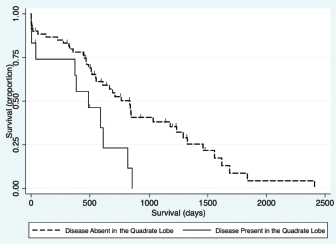 Fig. 5. Kaplan–Meier survival curve demonstrating that HCC present in the quadrate lobe had a significant association with a decreased survival in patients undergoing attempted definitive surgical resection (n=73) in the final multivariable model (HR=3.11, CI=1.47–6.59, p=0.003). Contrary to our hypothesis, this study failed to demonstrate a significant difference in MST between those dogs that had an attempted definitive surgery to remove the tumor, and those that only had a biopsy carried out for either non-resectable tumors, or incidentally found liver pathology (Fig. 3a). Interestingly, one of the dogs that had a tumor biopsied after it was deemed unresectable at the time of surgery by the operative surgeon was still alive at the conclusion of this study, more than 1,700 days later. The failure of finding a survival advantage in dogs undergoing attempted surgical resection of their tumors should be interpreted with caution. This study recruited cases from a histopathological data bank, meaning that all dogs in this cohort either had tumors that were diagnosed preoperatively and surgical resection appeared feasible, or had liver abnormalities found during exploratory celiotomy prompting biopsy. This data set does not include dogs with HCC where surgery was declined either due to clinical opinion that the particular case may not benefit from surgery or those dogs where surgery was declined by owners for a multitude of reasons. We are, therefore, still unable to accurately assess the effect of attempted definitive surgery on survival. Such analysis would require the comparison of outcome in dogs with equivalent disease following randomized treatment. Additionally, this cohort included a larger number of dogs that were incidentally diagnosed with HCC than reported previously (Liptak et al., 2004; Linden et al., 2019). The reason for this finding compared to previous evaluations is unknown; however, the lack of influence of attempted surgical resection on long-term survival highlights that HCC is unlikely to progress as a systemic disease and significant clinical signs may be secondary to its local presence. The findings of this study failed to demonstrate any significant difference in MST with completeness of surgical margins obtained during attempted surgical resection (Fig. 3c). This agreed with our hypothesis and likely due to the low reported metastatic rate of HCC. Previous reports on the association of complete resection and MST have been conflicting (Liptak et al., 2004; Matsuyama et al., 2017). One possible explanation is that histopathology does not allow the evaluation of the entire surgical margin and is only an estimate of actual margins. This could confound the results of retrospective studies such as this one. Despite this, survival times are still likely to be prolonged in patients that have their tumors incompletely resected. The perioperative mortality rate in this study was 6.4%, which is similar to previous studies of surgery for patients undergoing liver lobectomy (Liptak et al., 2004; Hanson et al., 2017; Linden et al., 2019). An increased risk of death before discharge was found in dogs with HCC in the right middle liver lobe. Isolation and resection of the right and central division of the liver is technically more difficult due to exposure and vascular anatomy (Liptak et al., 2004; Linden et al., 2019). A 40% intraoperative mortality rate has been reported for patients with right-sided liver tumors secondary to intractable hemorrhage (Liptak et al., 2004). Similarly, the incidence of perioperative hemorrhage in dogs having surgery to remove lobes in the central division is reportedly 33% (Linden et al., 2019). While the need for blood transfusion has been associated with decreased survival to discharge in patients undergoing hepatic surgery (Hanson et al., 2017); this was not repeatable in our study. The transfusion rate in this study was approximately 9%, which is similar to a previous report (Hanson et al., 2017), with no predilection for localization of disease. Although patients with disease present within the right medial liver lobe were at higher odds of dying prior to discharge in this cohort, this association was lost when considering long-term survival which is similar to a previous report (Liptak et al., 2004). Due to the increased risk of removing the central division of the liver (Liptak et al., 2004; Linden et al., 2019), and the long survival times that can be achieved without completely removing the tumor, surgical debulking of HCC in the central division may be considered in those instances when a more aggressive surgery is likely to put the patient’s life at risk. In this study, no difference was found in MST in dogs with disease identified in multiple versus single lobes (Fig. 3f) or between morphological subtypes (Fig. 3e). Historically, nodular or diffuse HCC subtypes have been thought to have a worse prognosis compared to massive HCC (Liptak and Withrow, 2013). This could be secondary to the surgical amenability of the massive subtype or presumably the increased liver function compromise that may occur with the nodular and diffuse forms (Liptak and Withrow, 2013). The difference found in this study could be due inconsistencies in identification of subtype, or reporting by the operative surgeon when compared to the original description by Patnaik et al. (1980). However, the incidence of the massive morphological subtype in this study was very similar to that in the afore-mentioned original study (69% vs. 61%, respectively) (Patnaik et al., 1980). Multivariable Cox regression in this study revealed presence of disease within the quadrate lobe, elevated potassium, elevated BUN value, and elevated GGT as negative prognostic indicators for survival for all patients. Older patients had shorter survival times when evaluating all patients, and patients with ASA scores of 4 and 5 had shorter survival times for patients undergoing attempted defini