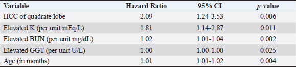 Open Vet. J.. 2021; 11(1): 144-153 doi: 10.4314/ovj.v11i1.21 Open Veterinary Journal, (2021), Vol. 11(1): 144–153 Original Research http://dx.doi.org/10.4314/ovj.v11i1.21 Factors associated with survival in dogs with a histopathological diagnosis of hepatocellular carcinoma: 94 cases (2007–2018)James Moyer, Daniel J. Lopez, Cheryl E. Balkman and Julia P. Sumner*Department of Clinical Sciences, College of Veterinary Medicine, Cornell University, Ithaca, NY, 14850, USA *Corresponding Author: Julia Sumner. Department of Clinical Sciences, College of Veterinary Medicine, Cornell University, Ithaca, NY, 14850, USA. Email: jsumner [at] cornell.edu Submitted: 03/01/2021 Accepted: 08/02/2021 Published: 23/02/2021 © 2021 Open Veterinary Journal