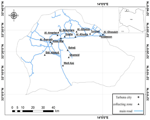 Fig. 1. Map of Tarhuna municipality showing the sampling locations. Collection and identification of ticksSamples were collected seasonally; in the summer (2–19 August 2015), autumn (9–11 November, 2015), winter (13–23 February 2016), and spring (12–24 May, 2016). Ticks were collected from a total of 145 animals (52 camels, 81 sheep, and 12 goats) from different locations (Fig. 1). The examined animals were local breeds of camels (4–12 years), sheep (1–6 years), and goats (1.5–4 years). Ticks were removed manually by forceps from each of the randomly selected hosts. The body sites where the ticks were collected from included ears, neck, tail, fore limb, udder, scrotum, and around eyes. The collected ticks were placed in vials containing ethanol 70% and preserved at room temperature. Data were taken for each sample, such as host type, the number of hosts, region, and date of collection. For identification, samples were transferred to the National Center for Disease Control’s Research Lab for Parasites and Vectors of Diseases in Tripoli. The ticks were placed on petri plates and morphologically identified using a tick taxonomy key under a dissecting microscope (Walker et al., 2003). Data analysisThe data were classified according to location, species, host, and season of collection. The average number of ticks per host was calculated by dividing the number of ticks (all species) collected from a particular type of hosts by the total number of individuals of hosts from which the ticks were collected. The average numbers of collected ticks per host were tested for normality by the one-sample Kolmogorov–Smirnov Z test. Thereafter, the data, which were not normally distributed, were compared using nonparametric tests, considering P=0.05 to be significant. All statistical analyses were carried out on SPSS 20.0 statistical software (SPSS, 2011). Ethical approvalNot required for this study. ResultsA total of 634 ticks (349 males, 280 females, and 5 nymphs) were collected from 145 animals (camels, sheep, and goats); the differences between collected stages were significant (χ2, p < 0.007). Four species of ticks were recorded (Table 1): Hyalomma dromedarii (83.12%), Rhipicephalus bursa (6.94%), Hyalomma excavatum (6.63%), and Rhipicephalus camicasi (3.31%). Each species collected from one or more hosts, but no species was collected from all hosts; the mean prevalence of all species was 4.37 tickshost. Significant differences were seen between the number of individuals of collected species (Kruskal–Wallis test, χ2=8.45, df=3, p=0.029); H. dromedarii differed significantly from all the three species using Mann–Whitney U test (p ≤ 0.021). Numbers of individuals of collected species varied among seasons (Table 1), but the difference was not significant (Kruskal–Wallis test, χ2=1.54, df=3, p=0.67). All species were recorded in autumn and winter, while only three species were recorded in spring and two species in summer. Tick prevalence increased in summer (6.53 tickshost), while the lowest prevalence was in spring (2.18 tickshost). The highest average number of H. dromedarii per host was in summer (Table 1), which was significantly higher than that of all other seasons ( χ2, p < 0.0005), while the other seasons were not different from each other (χ2, p > 0.4). Nymphs were found only in summer. R. camicasi was collected from sheep in autumn and winter, and from goats only in autumn. The highest average number of ticks per sheep was in autumn. No significant differences were found between seasons (χ2, p > 0.16). In H. excavatum, the highest average number of ticks per sheep was in autumn and then declined slightly in winter and spring; no ticks were collected from sheep in summer. While the highest average of ticks per goat was in autumn, followed by spring, no ticks were collected from goats in summer and winter. No significant differences were found between seasons (χ2, p > 0.15). Rhipicephalus bursa was collected in all seasons, with the highest average (1.02 tickssheep) in summer then gradually declined to one ticksheep in the other seasons, while it was collected from goats only in autumn with average one tick per goat. No significant differences were found between seasons (χ2, p > 0.32). Regarding sex ratio for tick species which were collected from the study area (Table 2), the differences between male and female was significant (χ2=14.835, df=1, p=0.0001). DiscussionThis is the first study that investigated ticks associated with livestock in Tarhuna. Four species were collected in Tarhuna. They were among the 25 species of ticks that were recorded in Libya (Hoogstraal and Kaiser, 1960; Gabaj et al., 1992; Hador, 2015). In this study, all individuals of H. dromedarii were collected from camels. Camels are the preferred host for this species (Elghali and Hassan, 2009; El Tigani and Mohammed, 2010; Biu and Konto, 2011; Fard et al., 2012). Hyalomma dromedarii was found in all seasons with the highest prevalence in summer; this may indicate that H. dromedarii adapts to extreme dryness (Salim-Abadi et al., 2010). Gharbi et al. (2013) found a positive correlation between temperature and tick burden and a negative correlation with relative humidity. H. dromedarii can transmit pathogens such as Theileria annulata and spotted fever group Rickettsia, which can cause mortality in camel populations (Al-Deeb et al., 2015). Rhipicephalus camicasi was recorded for the first time in Libya, by Al-Baida by Hador (2015), on sheep more than goats in autumn and winter. In this study, most of these species were collected from sheep and little from goats in autumn and winter. The preferred hosts of the adults of this species are sheep and goats (Walker et al., 2003). Table 1. Number of ticks collected during the study seasons between August 2015 and May 2016. The numbers in brackets indicate the average number of ticks per host.