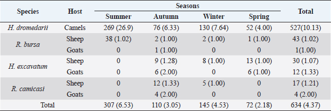 AbstractBackground: Twenty-five species of ticks have been recorded in Libya. No systematic studies have been conducted in Tarhuna region regarding tick species that infest livestock. Aim: To identify the species of ticks that infest livestock in Tarhuna, Libya. Methods: The study was carried out from August 2015 to May 2016 in Tarhuna, which is located in northwestern Libya. A total of 634 ticks (349 males, 280 females, and 5 nymphs) were collected from 145 randomly selected animals (camels, sheep, and goats). Samples were collected seasonally from different locations. Results: Four species of ticks were recorded: Hyalomma dromedarii (83.12%), Rhipicephalus bursa (6.94%), Hyalomma excavatum (6.63%), and Rhipicephalus camicasi (3.31%). The mean prevalence of all species was 4.37 ticks/host. All of the tick species were collected from sheep and goats, except H. dromedarii which was collected from camels only. With respect to the season of collection, the number of species varied among seasons; the highest prevalence was in summer (6.53 tickshost) and the lowest was in spring (2.18 tickshost). The highest average number of tick species was observed in H. dromedarii (10.13 ticks/host), followed by 1.21 ticks/host in R. camicasi, 1.07 ticks/host in H. excavatum, and the lowest in R. bursa (1.02 tick/host). Conclusions: These findings reveal that the abundance of ticks varied among species and seasons. Keywords: Ticks, Livestock, Prevalence, Seasons, Libya. IntroductionTicks are parasitic animals having a wide animal host range, including mammals, birds, reptiles, and amphibians (Hoogstraal, 1956; Burgdorfer et al., 1982). During the blood feeding, ticks can transmit bacteria, viruses, protozoa, and fungi to wildlife, livestock, and humans around the world (Tonbak et al., 2006; M’ghirbi et al., 2010; Mashebe et al., 2014). They are considered the second most important vector after mosquitoes in regard to disease transmitting agents (Parola and Raoult, 2001; Crowder et al., 2010) and they cause severe economic losses in livestock (Furman and Loomis, 1984). Tick species are distributed widely around the world. They are found in most, if not all, the countries of the world, especially in tropical and subtropical zones with appropriate humid and hot climate (Magnarelli, 2009). Climate plays an important role in the spread of ticks through its effect on vegetation (Belozerov, 1982). The occurrence records of vectors are important to assess the risk of associated vector-borne disease agents (Hutchings et al., 2016). Few studies have been, recently, published on the acarine parasites of farm livestock in Libya (Gabaj et al., 1992; Elsaid et al., 2013; Hador, 2015). Italian entomologists, physicians, and public health workers had generated reports based on small collections or single species (Gabaj et al., 1992). Twenty-five species of ticks have been recorded in Libya; 21 of them belong to family Ixodidae and the rest belong to family Argasidae (Hoogstraal and Kaiser, 1960; Gabaj et al., 1992; Hador, 2015) The apparition ectoparasites in sheep and goats’ flocks were poorly reported in Libya (Elsaid et al., 2013). No comprehensive studies have been carried out in this area regarding tick species that infest livestock in Tarhuna, where farm livestock is considered a part of the economic resources. It is important to have a knowledge of ticks infesting those animals to clarify the natural cycles of tick-borne pathogens for any control programs. This study aims to identify the species of ticks infesting livestock in Tarhuna. Materials and MethodsStudy areaThe study was carried out from August 2015 to May 2016 in Tarhuna which is located in northwestern Libya (32°26ʹ2″N, 13°38ʹ4″E), about 80 km southeast to Tripoli, and 398 meters above sea level (Fig. 1). The area is characterized by semidry climate, where semidesert plants are grown widely, such as thyme, rosemary, and white wormwood. The mean temperature, in general, varies between 10.8°C and 26°C, with an average annual rainfall of 237.6 mm.