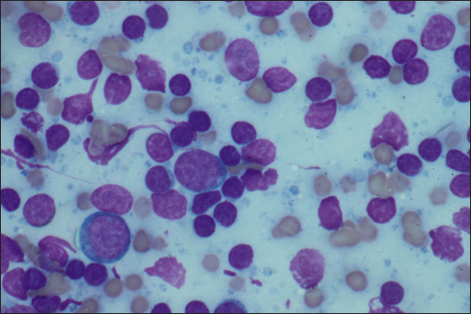 Fig. 2. FNA of the mass of Case 1. A mixed lymphocytic cell population with centroblasts, immunoblasts, and centrocytes (×1,000).