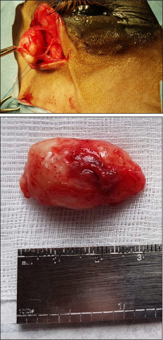 Fig. 4. Well encapsulated mass, easily dissected with no adherence to the adjacent tissues (Case 1). Case 2 The surgical procedure was similar but performed on a standing horse. The sedation was performed with a bolus of detomidine (10 µg/kg, Domidine®, Dechra) and morphine (0.1 mg/kg, Morphine®, Sterop). To maintain adequate sedation depth, a constant rate infusion was prepared with 10 mg of detomidine and 50 mg of morphine, added to 1 l of NaCl solution, in order to obtain a rate of 50–100 and 10–15 µg/kg/h, respectively. The rate of infusion was altered according to the Ghent Sedation Algorithm (Schauvliege et al., 2019). The gelding was administered intravenous flunixin meglumine (1.1 mg/kg, Emdofluxin®, Emdoka) and trimethoprim-sulfadiazine (30 mg/kg, Emdotrim®, Emdoka) preoperatively. An auriculopalpebral block was performed with 1 ml of 2% lidocaine (Xylocaine® 2%, Astrazeneca). Regional anesthesia was performed with 5 ml of 2% lidocaine, infiltered in the subcutaneous tissue around the mass. The mass was slightly more adherent to the underlying tissue compared to Case 1. Histopathological findingsBoth masses were fixed in 10% neutral buffered formalin. They were routinely processed for histopathology and stained with hematoxylin and eosin (Fig. 5). Case 1 The tissue was composed of a thickly encapsulated, markedly enlarged lymph node. A marked, diffuse hyperplasia of lymphoid follicles, with robust germinal center formation, was present and indicated its reactivity. In the majority of the follicles, antigen-related polarity was retained, with the presence of light and dark poles. There was a mild, multifocal expansion of the paracortex by small lymphocytes. The trabecular stroma was moderate to markedly and multifocally thickened, resulting in the isolation of large aggregates of lymphoid follicles and a multi-lobulated appearance. The vascular endothelial cells (particularly high endothelial venules) throughout the lymph node were moderate to markedly hypertrophied. Some small to medium-caliber lymphatic vessels were present in the tissue. Within the paracortical and medullary sinuses, there were mildly increased numbers of small lymphocytes and eosinophils. Analysis was consistent with a markedly chronically reactive lymph node. Case 2 The tissue was ovoid and surrounded by a thick fibrous capsule, multifocally infiltrated by small clusters of small lymphocytes and plasma cells. The mass was composed of numerous, closely packed, and sometimes coalescing nodular aggregates of lymphoid cells separated by anastomosing bands of the dense fibrovascular stroma. The majority of the lymphoid aggregates exhibited a large germinal center consisting of large lymphoid cells with large nuclei that contained reticular chromatin and 1–2 distinct basophilic nucleoli. There was an increased mitotic rate within these germinal centers, with up to 12 mitotic figures per high power field. Few small blood vessels were noted between the cells in the germinal centers. Few tangible body macrophages were observed. Sheets of small- and medium-sized lymphocytes surrounded the germinal centers along with rare plasma cells and mast cells. The findings were consistent with a chronically activated lymph node.