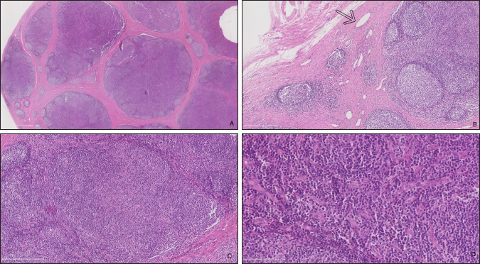 Fig. 5. Histopathologic analysis of case 1. (A) General overview of the lymph node: marked capsular sclerosis and lymphoid follicle hyperplasia. (B) Small lymphatic vessels (arrow) surrounding the hyperplastic lymphoid follicles. (C) Hyperplastic lymphoid follicles. (D) Eosinophilic infiltrates. Follow-upCase 1 The surgical site healed without complication and the filly was discharged after 5 days. At 18 months follow-up, the owner reported there was no evidence of a mass at the surgery site. Case 2 The gelding was discharged the day after surgery. No recurrence was noticed after an 8-months follow-up. DiscussionNeoplasms of the eye and adnexa are commonly described in horses. The most common periocular neoplasms include sarcoid and squamous cell carcinoma, followed by papilloma, lymphosarcoma, and melanoma (Giuliano, 2010). Based on histopathology, these neoplasms were excluded in the two horses reported here. The orbit is normally devoid of lymph nodes. Parotid lymph nodes in horses are located caudal to the ramus of the mandible, ventral to the temporo-mandibular joint, and deep to the cranial margin of the parotid salivary gland. While not described, a developmental migration of a parotid lymph node along the path of the transverse facial artery was considered a possibility in our cases. This hypothesis is difficult to confirm as the parotid lymph nodes are a cluster of multiple small nodes. In the second case, the ultrasound showed the presence of several parotid lymph nodes in their normal localization. The migration of one of them could not be excluded. On histopathology, small- to medium-caliber lymphatic vessels are observed in the first mass. The source of these lymphatic vessels is not clear: they may originate from elsewhere on the head or the orbit. The histologic features of the lymph nodes, including the prominent follicle formation and trabecular and capsular fibrosis, are indicative of chronic, reactive hyperplasia. The cause of lymph node reactivity remains unknown. Eosinophilic infiltration is not a typical feature of reactive lymph nodes: this inflammation may suggest a response to parasitism or allergy. However, previous focal infection or trauma was not reported and no (peri)ocular disease or systemic involvement was present at the time of the examination. In horses, focal eosinophilic inflammation is most commonly observed with eosinophilic granuloma, insect bites, parasites (such as Habronema, Thelazia, Onchocerca, Gasterophilus or a chronic arthropod infestation), and in idiopathic cases. In these horses, no evidence of parasitic infection was present. A thorough examination of the oral and nasal cavities by endoscopy would have been worthwhile as these structures are closely related to lymph nodes. Publications on ectopic lymph nodes are sparse. To the best of our knowledge, one case has been described in the veterinary literature. Necropsy of an 8-month-old heifer revealed an intracranial, extraneural ectopic lymph node (Clancy et al., 2018). It died following an acute onset of lethargy, dyspnea, and anorexia. A congenital abnormality was suspected. In humans, a 47-year-old female had an ectopic lymph node localized in the lacrimal gland region for 20 years (Wolter and Roosenberg, 1977) and a 24-year-old female had an inflamed lymph node localized at the lateral side of the upper eyelid (Ahn et al., 2018). Similar to our cases, there was no inflammatory process or systemic illness in the 47-year-old female. Surgical excision was curative for these patients and recurrence was not reported. ConclusionTo the authors’ knowledge, this is the first description of a periorbital ectopic lymph node in animals. Ectopic lymph nodes should therefore be included in the differential diagnosis of periocular masses in animals. Surgical excision was uncomplicated in these two cases. Based on these two animals, the prognosis for successful treatment of periorbital ectopic lymph nodes following surgical excision appears to be excellent in horses. Conflict of interestThe author declares that there is no conflict of interest Authors’ contributionsFlorine Narinx performed all the examinations, participated in both surgeries, drafted the manuscript, and revised the manuscript. Sébastien Monclin provided critical review. Aurélie Sauvage performed the examination of Case 1 and supervised the surgery of Case 2. Eline Vercruysse performed the first surgery. Marianne Heimann interpreted cytology (Case 1). Elizabeth Alloway interpreted the histopathology (Case 1). Maxime Vandersmissen performed both ultrasounds. Magda Grauwels was the clinician responsible for the entire supervision and critical review. ReferencesAhn, J., Park, M.H., Yoo, J.M. and Seo, S.W. 2018. A case of orbital lymph node misdiagnosed as a dermoid. J. Korean Ophthalmol. Soc. 59, 672–675. Aloisi, F. and Pujol-Borrell, R. 2006. Lymphoid neogenesis in chronic inflammatory diseases. Nat. Rev. Immunol. 6, 205–217. Carragher, D.M., Rangel-Moreno, J. and Randall, T.D. 2008. Ectopic lymphoid tissues and local immunity. Semin. Immunol. 20, 26–42. Chen, L. 2009. Ocular lymphatics: state-of-the-art review. Lymphology 42, 66–76. Clancy, C.S., Van Wettere, A.J. and Hullinger, G.A. 2018. Intracranial, extraneural ectopic lymph node in a bovine (Bos taurus). Anat. Histol. Embryol. 47, 385–388. Dickinson, A.J. and Gausas, R.E. 2006. Orbital lymphatics: do they exist? Eye 20, 1145–1148. Eichenbaum, J.D., Lavach, J.D., Severin, G.A. and Paulsen, M.E. 1987. Immunology of the ocular surface. Compend. Contin. Educ. Vet. 9, 1101–1109. English, R. and Gilger, B.C. 2021. Ocular immunology. In Veterinary ophthalmology, 6th ed. Eds., Gelatt, K.N., Ben-Shlomo, G., Gilger, B.C., Hendrix, D.V.H., Kern, T.J. and Plummer, C.E. MI: Wiley Blackwell, pp: 263–292. Giuliano, E.A. 2010. Equine periocular neoplasia: current concepts in aetiopathogenesis and emerging treatment modalities. Equine Vet. J. Suppl. 37, 9–18. Schauvliege, S