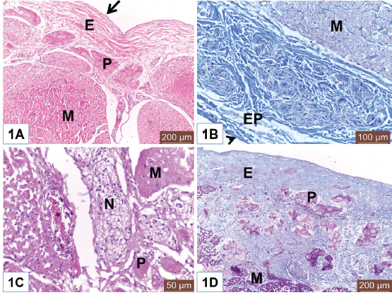 Fig. 1. (A) Photomicrograph of the ventricle from mature Egyptian bovine showed endocardium (E) and myocardium (M). Notice endothelial lining (Arrow) of the endocardium. Also, Purkinje fiber (P) in the endocardial layer. H&E. Scale bars=200 μm. (B) Photomicrograph of the ventricle from mature Egyptian bovine showed epicardium (EP) and myocardial bundles (M). Notice outer mesothelium (Arrowhead). Masson’s trichrome method. Scale bars=100 μm. (C) Photomicrograph of the ventricle from immature Egyptian bovine showed myocardium (M), Purkinje fiber (P), and nerve fibers (N). H&E. Scale bars=50 μm. (D) Photomicrograph of the ventricle from adult Egyptian bovine showed wide endocardium (E). Notice Purkinje fibers (P) and cardiac muscles of the myocardium (M). Masson’s trichrome method. Scale bars=200 μm. Myocardium consisted of bundles of cardiac muscles (Fig. 2D). In both mature and adult animals, some cardiac muscles show dark cytoplasm (hypereosinophilia) and others had lighter cytoplasm (Fig. 3A and 3D). Fine connective tissue (CT) among myocardial bundles is observed in immature animal (Fig. 3B); however, the amount of CT is increased and become the widest in adult animal (Fig. 3C). Fine collagen fibers are surrounding myocardial cells (Fig. 3D). Epicardium consists of CT and is covered externally with mesothelium. Nerve fibers can be seen within this layer (Fig. 2D). DiscussionThe heart is a muscular pump that contracts rhythmically to propel blood around the body via the blood vessels. It is well known that the wall of the heart consists of three layers; endocardium, myocardium, and epicardium. The ventricles of Egyptian bovine, like other animals, consisted of those three layers that were similar to reported by Ghazy et al. (2018). The endocardium is the innermost that was covered with a thin layer of endothelium underlying the subendothelial connective tissue layer. This finding was similar to Gálfiová et al. (2017). Deep to the endocardium, clusters of Purkinje fibers were distributed, as a part of the conducting system of the heart. This supports the finding of Ansari et al. (1999). Like finding of Koprla and Nemeséri (1984), our histological results showed few amount of myofibrils in a pale cytoplasm of the Purkinje fibers. This histological feature varied depending on ages (Forsgren, 1982); therefore, our results revealed a higher amount of myofibrils in the Purkinje fibers of older animals. The present study observed the close localization of the nerve fibers to Purkinje fibers that point to the nerve-Purkinje fiber relationship as reported by Jensen et al. (1978) and Crick et al. (1999) as they referred to the importance of the nervous control for cardiac performance in rhythm. Also, Kawano et al. (2003) demonstrated the presence of more autonomic nerves in the subendocardial area than in the subepicardial area of the human ventricle.
