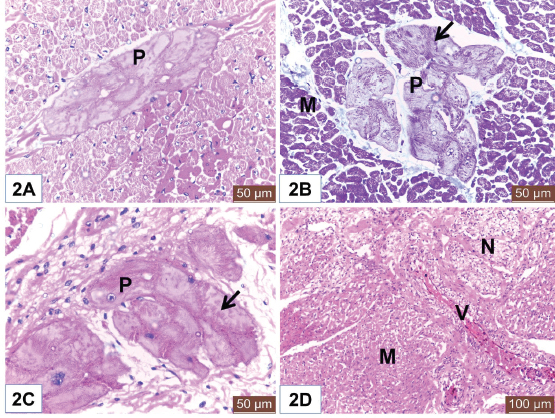 Fig. 2. (A) Photomicrograph of the ventricle from mature Egyptian bovine showed intramural Purkinje fiber (P) in between myocardial bundles. Notice hypereosinophilia of some cardiac muscle cells. H&E. Scale bars=50 μm. (B) Photomicrograph of the ventricle from adult Egyptian bovine showed intramural Purkinje fibers (P). Notice myofibrils (Arrow) and cardiac muscles of the myocardium (M). Masson’s trichrome method. Scale bars=200 μm. (C) Photomicrograph of the ventricle from mature Egyptian bovine showed Purkinje fiber (P) with pale cytoplasm and few myofibrils (Arrow). H&E. Scale bars=50 μm. (D) Photomicrograph of the ventricle from immature Egyptian bovine showed myocardium (M), blood vessels (V), and nerve fibers (N). H&E. Scale bars=100 μm. The intramural Purkinje fibers, in this study, were seen among the myocardium that confirms the ramification of Purkinje fibers within endocardium and myocardium as recorded by Ryu et al. (2009) in sheep and Ghonimi et al. (2014) in camel but, these fibers were not identified in the heart of human (Durrer et al., 1970; Oosthoek et al., 1993). The presence of intramural Purkinje fibers in the myocardium results in a more efficient excitation of the ventricles compared with the absence of intramural Purkinje fibers (Oosthoek et al., 1993; Tranum-Jensen et al., 1991) as they prevent intercyclic pre-excitation of the ventricular myocardium. Our observation revealed a relative increase in the thickness of the endocardium with the advanced age that in accordance with Centurion et al. (2003).