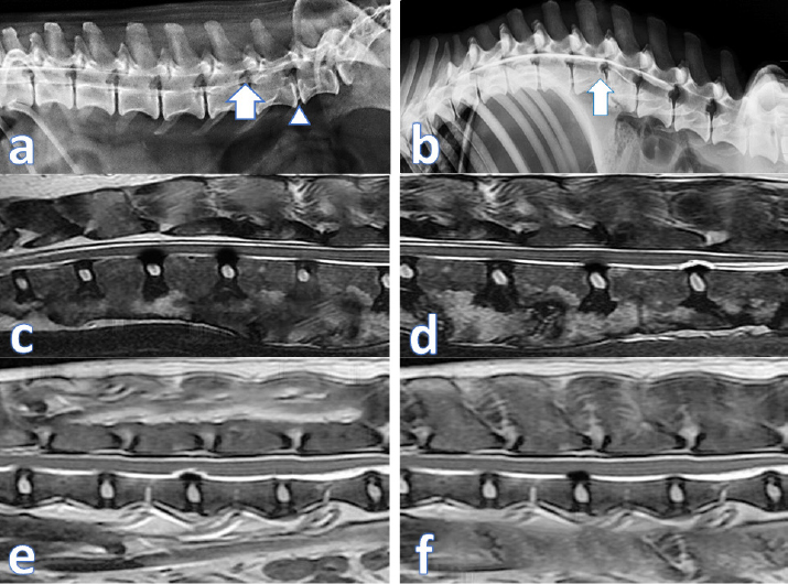 Fig. 4. (a) contrast Myelography where spinal cord of a cat 1 showing mild degree of spinal cord compression (arrow) and severe disc compression and mineralization (arrow head); (b) spinal cord myelography of a dog 1 showing severe compression (arrow); (c) MRI scan of cat 2 showing the protrusion of 2 discs before treatment; (d) MRI scan of Dog 2 showing the same lesion after treatment; (e) MRI scan of cat 2 showing the disc protrusion before treatment; (f) MRI scan of cat 2 showing the same lesion after treatment. Although clinical lameness score analysis for all examined cases showed quick improvements in week two post treatment, where cats showed a slightly better improvement curve than dogs after 15 days from treatment and after that. Noticeable improvements continued until 45 days in cats and 60 days in dogs. The lameness scores became steady for both species until the end of the observation period. These findings coincided with our previous studies that: (1) the injected cells migrated to the site of lesions (homing) within the first week; (2) the effect of inhibiting apoptosis, stimulating regeneration, remyelination and differentiation into neural cell lines occurs from the second week up to a month (Abdallah et al., 2019). By 45 days post treatment, the injected cells cease to exist in the extracellular space, and their reparative effect is diminished. This would propose a second injection at 45 days that will regain the reparative effect and increase the chances of a full recovery. The proprioception and nociception reflexes were restored, and animals regained control of the urination and defecation, which confirms the studies on animal models like rats and mice (Neirinckx et al., 2015; Elawady et al., 2016) and dogs (Gabr et al., 2015). ConclusionBM-MNCs in PRP vehicle transplantation for spinal cord injury is a safe procedure, time-saving, and provided a passage to functional recovery and restoration of the locomotor and sensory activity in companion animals. The utmost effect of the single injection lasts for 45 days. A second injection at 45 days may increase the chances of full recovery. This treatment shows a promising hope for the treatment of chronic spinal cord injuries. AcknowledgmentsThis paper is based upon the work supported by Science, Technology & Innovation Funding Authority (STDF) under grant (26268). Conflict of interestThe authors declare that there is no conflict of interest. Authors’ contributionAshraf Shamaa and Omar EL-Tookhy were responsible for case evaluation before and after the treatment. Ahmed Abdallah was responsible for the preparation of the stromal/SCs and PRP. All authors read and approved the final manuscript. Supplementary materialSupplementary video showing the clinical improvement of One link including case 1 as follows: https://www.openveterinaryjournal.com/case-1 ReferencesAbdallah, A.N., Shamaa, A.A. and El-Tookhy, O.S. 2019. Evaluation of treatment of experimentally induced canine model of multiple sclerosis using laser activated non-expanded adipose derived stem cells. Res. Vet. Sci. 125, 71–81; doi:10.1016/j.rvsc.2019.05.016. Akiyama, Y., Radtke, C., Honmou, O. and Kocsis, J.D. 2002. Remyelination of the spinal cord following intravenous delivery of bone marrow cells. Glia 39, 229–236; doi:10.1002/glia.10102. Amable, P.R., Carias, R.B.V., Teixeira, M.V.T., da Cruz Pacheco, I., Corrêa do Amaral, R.J.F., Granjeiro, J.M. and Borojevic, R. 2013. Platelet-rich plasma preparation for regenerative medicine: optimization and quantification of cytokines and growth factors. Stem Cell Res. Ther. 4, 67; doi:10.1186/scrt218. Amemori, T., Ruzicka, J., Romanyuk, N., Jhanwar-uniyal, M., Sykova, E. and Jendelova, P. 2015. Comparison of intraspinal and intrathecal implantation of induced pluripotent stem cell-derived neural precursors for the treatment of spinal cord injury in rats. Stem Cell Res. Ther. 6, 1–11; doi:10.1186/s13287-015-0255-2. Bartholdi, D. and Schwab, M.E. 1998. Oligodendroglial reaction following spinal cord injury in rat: transient upregulation of MBP mRNA. Glia 23, 278–284. Dasari, V.R., Spomar, D.G., Cady, C., Gujrati, M., Rao, J.S. and Dinh, D.H. 2007. Mesenchymal stem cells from rat bone marrow downregulate caspase-3-mediated apoptotic pathway after spinal cord injury in rats. Neurochem. Res. 32, 2080–2093; doi:10.1007/s11064-007-9368-z. Denny, H.R. and Butterworth, S.J. 2000. Further investigation of spinal diseases. Elawady, M.A., Elmaghrabi, M.M., Ebrahim, N., Elawady, M.A., Sabry, D., Shamaa, A. and Ragaei, A. 2016. Therapeutic potential of bone marrow derived mesenchymal stem cells in modulating astroglyosis of surgical induced experimental spinal cord injury. Adv. Biosci. Biotechnol. 7(6), 251–265. Gabr, H., El-Kheir, W.A., Farghali, H.A.M.A., Ismail, Z.M.K., Zickri, M.B., El Maadawi, Z.M., Kishk, N.A. and Sabaawy, H.E. 2015. Intrathecal transplantation of autologous adherent bone marrow cells induces functional neurological recovery in a canine model of spinal cord injury. Cell Transplant. 24, 1813–1827; doi:10.3727/096368914X683025. Gronthos, S., Franklin, D.M., Leddy, H.A, Robey, P.G., Storms, R.W. and Gimble, J.M. 2001. Surface protein characterization of human adipose tissue-derived stromal cells. J. Cell. Physiol. 189, 54–63; doi:10.1002/jcp.1138. Hunt, D.P.J., Irvine, K.A., Webber, D.J., Compston, D.A.S., Blakemore, W.F. and Chandran, S. 2008. Effects of direct transplantation of multipotent mesenchymal stromal/stem cells into the demyelinated spinal cord. Cell Transplant. 17, 865–873; doi:10.3727/096368908786516738. Kennea, N.L., Waddington, S.N., Chan, J., O’Donoghue, K., Yeung, D., Taylor, D.L., Al-Allaf, F.A, Pirianov, G., Themis, M., Edwards, A.D., Fisk, N.M. and Mehmet, H. 2009. Differentiation of human fetal mesenchymal stem cells into cells with an oligodendrocyte phenotype. Cell Cycle 8, 1069–1079; doi:10.4161/cc.8.7.8121. Kerr, C.L., Letzen, B.S., Hill, C.M., Agrawal, G., Thakor, N.