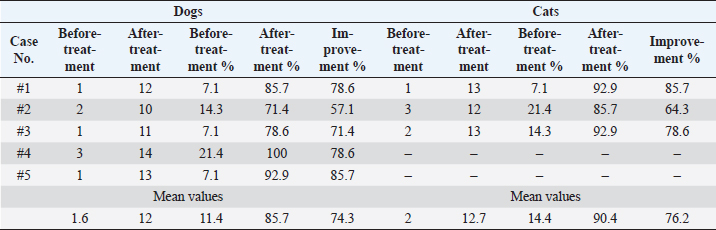 Fig. 3. Mean values of lameness score for all examined cases before treatment and at 15, 30, 45, 60, 75 and 90-days post treatment. The other part of the cells was applied intravenously to obtain full coverage of the lesion to reach the spinal cord or the damaged peripheral nerves too (Akiyama et al., 2002; Kim et al., 2015). The systemic application of cells was safe and did not produce any adverse reactions or complications as stated in the previous studies. The MRI scans did not show a major improvement regarding the protruded discs. This might be attributed to the longer periods required for intervertebral discs to heal (Skovrlj et al., 2015). However, the clinical signs were ameliorated due to the transplanted SCs capable of stopping the inflammation, necrosis, and apoptosis and stimulating the regeneration of the neurons and axons (Kim et al., 2015). This combination proved its safety as no adverse effects were recorded in all animals included in this study from the surgery day till 90 days post-transplantation. The clinical evaluation of the transplanted cells proved its efficacy in the treatment of the spinal cord, which was noticed even before reaching the end of the evaluation period, where animals were able to maintain full weight bearing walking more than 75% of the time without assistance. The final lameness score for all examined cases at the end of the observation period showed great improvements with a mean value percentage of 74.3% and 76.2% for dogs and cats respectively, compared to their initial lameness score values. One dog case showed complete recovery after the 90 days observation period post-treatment. It was worth noticing that the animals starting with a higher degree of lameness (lesser Olby’s values) showed better results at the end of the observation period.
