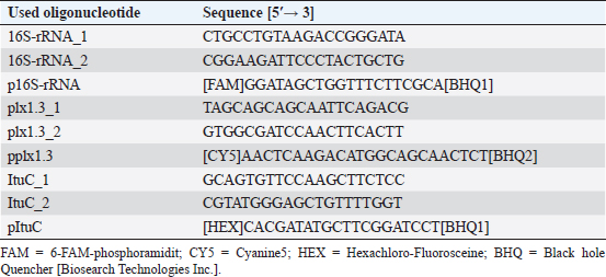Germination of P. larvae spores on different preparations of CSAGermination assays were performed with spore suspensions from P. larvae DSM 17237 (RSK16 standard; LAVES IB CE). Aliquots of 200 µl RSK 16 standard were spread on CSA-LAVES (homemade) and commercially available CSA-Oxoid (Oxoid) and CSA-BD plates BD plates. Germination rates of spores were quantified and compared after 3 and 6 days. The mean and its standard error were determined. Significance was tested by Student’s t-test. Multiplex quantitative PCR (mqPCR) for P. larvaeMaterial from P. larvae colonies was homogenized in 50 µl sterile, deionized water, and incubated at 95°C for 15 minutes and 250 rpm. To sediment the bacterial debris, the mixture was centrifuged for 5 minutes at 5,000 × g. The supernatant was then used as template for mqPCR. The sequences of primers and probes targeting P. larvae are shown in Table 2. Oligonucleotides were designed based on the 16S rRNA sequence of P. larvae and the ItuC and Plx1 encoding sequences (http://bioinfo.ut.ee/primer3-0.4./) using the genome data of P. larvae DSM 7030 and DSM 25430 (Fünfhaus et al., 2013; Djukic et al., 2014; Sood et al., 2014; Hertlein et al., 2016; Rossi et al., 2018). The mqPCR reactions were performed in a total volume of 20 µl containing 10 µl 2× Luna Universal Probe qPCR Mix (NEB, Germany), 0.4 µM of each primer (eurofins genomics, Germany), 0.2 µM of each probe (eurofins genomics, Germany), 2.0 µl template and nuclease-free water to reach the reaction volume. The amplification was performed in an ARIA MX qPCR thermocycler (Agilent, USA), according to the manufacturer instruction (initial denaturation 95.0°C; 40 cycles: 95.0°C for 15 seconds and 60.0°C for 30 seconds, including detection of amplification at the end of the 60.0°C step). A no template control (NTC) was used, as well as P. larvae reference strains for genotype ERIC I and ERIC II (positive controls), and P. alvei as negative control. Amplification was analyzed using the Aria Agilent 1.3 software (Agilent, USA). Targets were interpreted as positive (“detected”) when Finall Call (ΔRn) was marked as “+” by the software, with a quantification cycle (Cq) (ΔRn) ≤ 30 (Ruiz-Villalba et al., 2017). Table 2. Primer and Probes used for detection and genotyping of P. larvae by multiplexed qPCR.