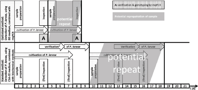 Fig. 2. Schematic comparison of the current standard culture-based method to detect P. larvae in honey and food samples and the newly developed protocol which combines optimized culture and mqPCR. ConclusionBy combining a culture-based approach on CSA-BD with multiplex qPCR, we were able to detect and genotype P. larvae reference strains and field isolates within 4 days (Fig. 2). This is half of the time needed with the actual official standard protocol (Amtliche Methodensammlung, 2017). Since time consuming methods, such as purification of bacterial DNA, gel electrophoresis, and interpretation of fragment patterns are not necessary, the newly developed multiplex qPCR allows a higher throughput of samples, may reduce costs for monitoring surveys, and permit faster interventions to prevent the spread of AFB. AcknowledgmentsThe authors would like to thank Katlen Schütze, Florian Hinz and Friewi Lienau for excellent technical assistance. Author’s contributionsHannes Beims designed the experiments for mqPCR and was involved in data analysis of germination assays. Martina Janke and Werner von der Ohe provided the germination assays and verified analytical methods. Michael Steinert analyzed the derived data. All authors discussed the results and contributed to the final manuscript. ReferencesAmtliche Methodensammlung. 2017. Amerikanische Faulbrut (Erreger: Paenibacillus larvae). Friedrich-Loeffler-Institut (FLI), Stand 09.06.2017, 7. Ash, C., Farrow, J.A.E., Wellbanks, S. and Collins, M.D. 1991. Phylogenetic heterogeneity of the genus Bacillus revealed by comparative analysis of small subunitribosomal RNA sequences. Lett. Appl. Microbiol. 13, 202–206. Beims, H., Bunk, B., Erler, S., Mohr, K.I., Spröer, C., Pradella, S., Günther, G., Rohde, M., von der Ohe, W. and Steinert, M. 2020. Discovery of Paenibacillus larvae ERIC V: Phenotypic and genomic comparison to genotypes ERIC I-IV reveal different inventories of virulence factors which correlate with epidemiological prevalences of American Foulbrood. Int. J. Med. Microbiol. 310(2), 151394. https://doi.org/10.1016/j.ijmm.2020.151394. Beims, H., Wittmann, J., Bunk, B., Spröer, C., Rhode, C., Günther, G., Rohde, M., von der Ohe, W. and Steinert, M. 2015. Paenibacillus larvae-directed bacteriophage HB10c2 and its application in American Foulbrood-affected honey bee larvae. Appl. Environ. Microbiol. 81(16), 5411–5419. De Graaf, D.C., Alippi, A.M., Brown, M., Evans, J.D., Feldlaufer, M., Gregorc, A., Hornitzky, M., Pernal, S.F., Schuch, D.M.T., Titera, D., Tomkins, V. and Ritter, W. 2006. Diagnosis of American foulbrood in honey bees: a synthesis and proposed analytical protocols. Lett. Appl. Microbiol. 43, 583–590. Descamps, T., De Smet, L., Stragier, P., De Vos, P. and de Graaf, D.C. 2016. Multiple locus variable number of tandem repeat analysis: a molecular genotyping tool for Paenibacillus larvae. Microb. Biotechnol. 9(6), 772–781. Djukic, M., Brzuszkiewicz, E., Fünfhaus, A., Voss, J., Gollnow, K., Poppinga, L., Liesegang, H., Garcia-Gonzalez, E., Genersch, E. and Daniel, R. 2014. How to kill the honey bee larva: Genomic potential and virulence mechanisms of Paenibacillus larvae. PLoS One 9, e90914. Dobbelaere, W., de Graaf, D.C., Peeters, J.E. and Jacobs, F.J. 2001. Development of a fast and reliable diagnostic method for American foulbrood disease (Paenibacillus larvae subsp. Larvae) using 16S rRNA gene based PCR. Apidologie 32, 363–370. Ebeling, J., Knispel, H., Hertlein, G. and Fünfhaus, A. 2016. Biology of Paenibacillus larvae, a deadly pathogen of honey bee larvae. Appl. Microbiol. Biotechnol. 100, 7387–7395. Forsgren, E., Stevanovic, J. and Fries, I. 2008. Variability in germination and in temperature and storage resistance among genotypes. Vet. Microbiol. 129(3–4), 342. Fünfhaus, A., Poppinga, L. and Genersch, E. 2013. Identification and characterization of two novel toxins expressed by the lethal honey bee pathogen Paenibacillus larvae, the causative agent of American foulbrood. Environ. Microbiol. 15(11), 2951–2965. Genersch, E. 2010. American Foulbrood in honeybees and its causative agent, Paenibacillus larvae. J. Invertebr. Pathol. 103, 10–19. Genersch, E. and Otten, C. 2003. The use of repetitive element PCR fingerprinting (rep-PCR) for genetic subtyping of German field isolates of Paenibacillus larvae subsp. larvae. Apidologie 34, 195–206. Genersch, E., Ashiralieva, A. and Fries, I. 2005. Strain- and genotype-specific differences in virulence of Paenibacillus larvae subsp. larvae, a bacterial pathogen causing American foulbrood disease in honeybees. Appl. Environ. Microbiol. 71, 7551–7555. Genersch, E., Forsgren, E., Pentikäinen, J., Ashiralieva, A., Rauch, S., Kilwinski, J. and Fries, I. 2006. Reclassification of Paenibacillus larvae subsp. pulvifaciens and Paenibacillus larvae subsp. larvae as Paenibacillus larvae without subspecies differentiation. Int. J. Syst. Evol. Microbiol. 56, 501–511. Govan, V.A., Allsopp, M.H. and Davison, S. 1999. A PCR detection method for rapid identification of Paenibacillus larvae. Appl. Environ. Microbiol. 65(5), 2243–2245. Hertlein, G., Seiffert, M., Gensel, S., Garcia-Gonzales, E., Ebeling, J., Skobalj, R., Kuthning, A., Süssmuth, R.D. and Genersch, E. 2016. Biological role of paenilarvins, Iturin-like lipopeptide secondary metabolites produced by the honey bee pathogen Paenibacillus larvae. PLoS One. 11(10): e0164656. doi:10.1371/journal.pone.0164656. Morrissey, B.J., Helgason, T., Poppinga, L., Fünfhaus, A., Genersch, E. and Budge, E. 2015. Biogeography of Paenibacillus larvae, the causative agent of American foulbrood, using a new multilocus sequence typing scheme. Environ. Microbiol. 17(4), 1414–1424. Nordström, S. and Fries, I. 1995. A comparison of media and cultural conditions for identification of Bacillus larvae in honey. J. Apicult. Res. 34, 97–103. OIE. 2008. Manual of Diagnostic Tests and Vaccines for Terrestrial Animals, 6th ed. Charpter 2.9.