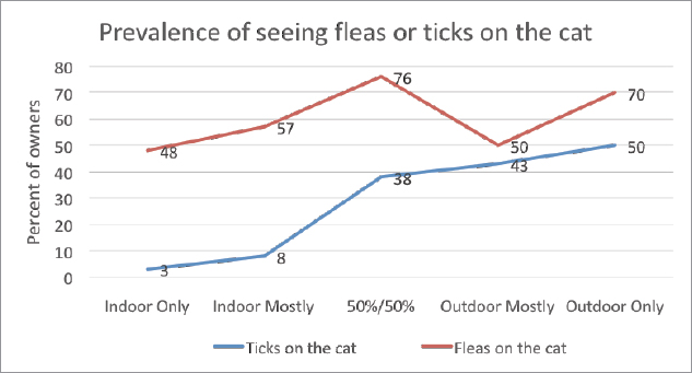ResultsAttending veterinarian demographicsVeterinarians from 26 participating practices completed the demographics questionnaire, but not all veterinarians answered all questions. Veterinarians were approximately evenly divided by gender and in general had many years of practice experience (Table 1). Most veterinarians surveyed recommended year-round control for fleas (90%) and ticks (79%), and the average recommended duration of coverage was close to 1 year for both fleas and ticks. The lower percentage of veterinarians recommending year-round tick control was due primarily to geographic variation in tick prevalence, with two practitioners in California recommending no tick control for cats in their practices. Veterinarians with ≤10 years of practice experience were more likely to recommend year-round protection for ticks, compared to veterinarians with more than 10 years in practice experience. Cat-owner demographicsA total of 451 cat-owner clients submitted the survey, although not all respondents answered every question (Table 2). Respondents were predominately female, and their age was distributed (across age blocks) from <20 to >55 years. The largest group of female respondents (25%) were in the 20–35-year block and the largest group of male respondents (34%) were in the >55-year block. Respondents were experienced owners, averaging 6.9 years as primary caregivers for their cats. Over half of the owners (54%) had directly observed fleas on their cats at some time, with a smaller percentage observing fleas in environmental locations or on family members. Forty-four percent of the respondents had never observed fleas on their cats or in their local environment. In comparison, 76% of the owners had never observed ticks, either on their cats or elsewhere in the home setting (Table 2). When the percentage of owners who observed fleas and ticks on their cats was sorted by the cat’s indoor or outdoor status, there was a trend toward greater prevalence of infestation as outdoor status increased, particularly for ticks (Fig. 1). Nearly three-quarters (75%) of the cat owners understood their veterinarian’s recommendation for flea and tick coverage to be 10–12 months (Table 2), tracking closely with veterinarians’ actual recommendations (Table 1). One in six cat owners (16%) was unaware of their veterinarian’s coverage recommendation for flea and tick control. Two-thirds of the cat owners had used ectoparasiticide products other than fluralaner, while only a minority (14%) used heartworm preventive medication in their cats. Feline patient demographicsThe demographic profile of the cats represented in the owner survey (Table 3) indicates a similar proportion of male and female cats, with almost all (95%) spayed or neutered. The mean body weight (± SD) for cats in this study was 5.1 (± 0.9) kg and the mean age was 7.1 (± 1.4) years. Close to one-third of the cats (29%) had routine outdoor access, and approximately half were exclusively indoor cats. Of the indoor only cats, 48% of the cat owners had seen fleas on the cat. We do not know if the indoor only cats lived with a cat that went outdoors and do not know when fleas were observed, relative to the time that the cat was acquired. The owners had seen fleas on 64% of the cats that spend time outdoors. Owners of 19% of the cats observed fecal tapeworm segments, suggesting flea infestation. Almost all owners (94%) indicated their cats were in good or excellent health. Most cats (77%) lived in multi-pet settings, averaging 2.3 cats and 1.8 dogs, when other animals were present in the household.