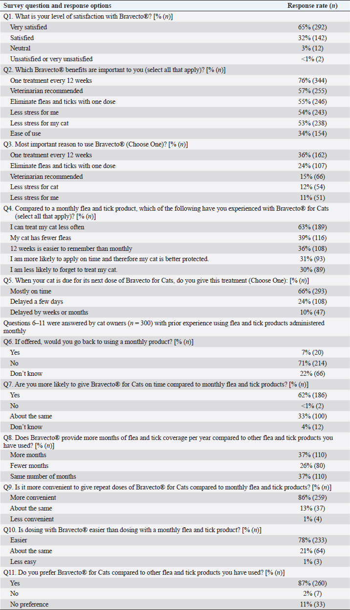 Ethical approvalThis study did not involve testing of live animals. Respondent cat owners provided signed informed consent prior to completing the survey. Table 4. Responses of US cat owners prescribed fluralaner to a survey of their flea and tick treatment satisfaction, preferences, and adherence.