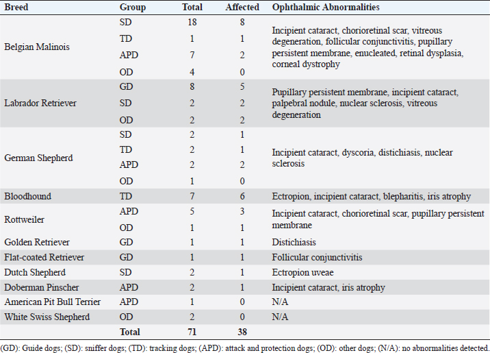 AbstractBackground: Working dogs, such as police dogs and guide dogs, have important roles in the contemporary society by performing specific and demanding jobs. Ocular health and the maintenance of good visual acuity are imperative to strong work performance and thus human safety. Aim: The aim of this study was to assess ophthalmic abnormalities and refractive errors in police and guide dogs in Brazil. Methods: A total of 71 dogs (141 eyes) were evaluated. Ten were guide dogs and 61 were police dogs. The work performance was assessed by a questionnaire to each dog’s handler/owner. All the dogs underwent a complete ocular examination, and abnormalities were classified by condition, if they were active or inactive and if they were located within the visual axis. In addition, 62 dogs were evaluated by streak retinoscopy for refractive errors. Results: Ophthalmic abnormalities were detected in 38 (54%) dogs, of which 23 were considered inherited, 25 were considered active, and 10 were located within the visual axis. Incipient cataracts were the most prevalent abnormality. No guide dog had an abnormality within the visual axis. The most common refractive error was myopia with the median and interquartile range of –0.75 ± 0.75 diopters; among these, police dogs had –1.0 ± 0.5 diopters, whereas guide dogs +0.38 ± 0.75 diopters. Police dogs tended to be slightly myopic and guide dogs were emmetropic. Conclusion: Despite finding a considerable number of ophthalmic abnormalities and refractive error, work performance was good with no signs of visual impairment in any dog. Regular ophthalmic examinations are advised for working dogs, and an exclusion of severely affected dogs from breeding programs is recommended. Keywords: Cataract, Emmetropia, Guide dogs, Myopia, Police dogs. IntroductionFor centuries, dogs have worked alongside humans in a variety of roles (Sloane, 1955; Handy et al., 1961; Fishman, 2003; Dever, 2015). Two subgroups of specialized working dogs have more recently become important in very specific work roles: police dogs and service dogs. Police dogs are chosen and trained to perform a diverse number of activities based on their primary skill or ability, including protective guard in dangerous situation, such as criminal confrontation and olfactory detection of narcotics, explosives, and/or people (Sloane, 1955; Handy et al., 1961; Gazit and Terkel, 2003). Service dogs, however, primarily assist people with specific needs or disabilities, including serving as guide dogs for the blind or severely visually impaired (Riederle, 1999; Fishman, 2003; Craigon et al., 2017). The working dogs are costly to select and train, and thus, maintaining them at a high level of performance as long as possible is desired (Handy et al., 1961; Parr and Otto, 2013). The maintenance of good general health is important to provide longevity in the work field and good overall quality of life (Moore et al., 2001; Parr and Otto, 2013; Caron-Lormier et al., 2016a). Ophthalmic health and good visual acuity are, especially, important for many working dogs, particularly those whose jobs are visually dominant (e.g., guide dogs for the blind). Maintenance of good visual acuity requires a transparent optical pathway, precise optical refraction, and appropriate neuronal processing in the retina, visual pathways, and visual cortex (Miller and Murphy, 1995). For example, refractive errors can cause an image to appear defocused, leading to poor vision and an overall negative impact on performance (Ofri et al., 2012). However, abnormalities in any of these areas can lead to some degree of visual impairment, even blindness, which ultimately can lead to retirement and even euthanasia of a working dog. The previous surveys of police dogs have shown that ocular disease was responsible for 1.4% of medical emergencies (Parr and Otto, 2013), 2.4% of retirement from service (Evans et al., 2007), and 11% of death and euthanasia (Moore et al., 2001). For guide dogs, eye diseases have been ascribed to constitute 3.2% of early retirement from service (Caron-Lormier et al., 2016b). Some breeds that are commonly used as working dogs have a predisposition to heritable or acquired ophthalmic disorders that can cause progressive vision loss that may go unnoticed by the handlers, trainers, or owners; until it, there is moderate-to-advanced visual impairment (e.g., corneal disease, cataracts, and progressive retinal atrophy) (Barnett, 1986; Curtis and Barnett, 1989; Kommonen et al., 1997; Kraijer-Huver et al., 2008; Jokinen et al., 2011; Takanosu, 2017). In addition, some working breeds can spontaneously develop refractive errors (myopia or hyperopia) that can have a significant impact on visual acuity (Murphy et al., 1992; Mutti et al., 1999; Soares et al., 2004; Black et al., 2008; Kubai et al., 2008, 2013; Williams et al., 2011). For example, defocus by as little as –1.5 diopters worsens significantly a dog’s performance to find distant objects (Murphy et al., 1997; Ofri et al., 2012). The purpose of this study was to evaluate the prevalence of ophthalmic abnormalities and the refractive states in a population of police and guide dogs in Southern Brazil and to compare the findings with the type of job performed by the dogs and the potential consequences of aberrations in visual quality. Materials and MethodsThe animals used were service dogs from four different military and police corporations: 20° Batalhão de Infantaria Blindada (20º Armored Infantry Battalion—20° BIB), Batalhão de Operações Especiais do Paraná (Paraná´s Battalion of Special Police Operations—BOPE), Guarda Municipal de Curitiba (Curitiba’s Municipal Guard—GMC), and Departamento Estadual de Prevenção e Repressão ao Narcotráfico (State Department for the Prevention and Suppression of Drug Trafficking—DENARC). In addition, the guide dogs used were from the Helen Keller guide dog training school, and there are three privately owned gu