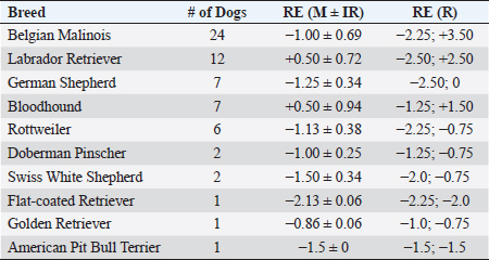 Table 3. Refractive errors (RE) in working dogs by breed (median of right, left, and both eyes) and by working group (median ± interquartile range).