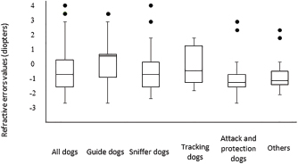 Fig. 3. Box plot graph of the refractive errors of 62 police and guide dogs. All dogs are displayed in the first column and subsequently divided into five groups. Both “attack and protection dogs” and “others” have narrower ranges when compared to other groups. Only 10 ophthalmic abnormalities were located within the visual axis and were only found in police dogs. TD and SD rely more on olfaction rather than vision (Gazit and Terkel, 2003), and thus, the ocular abnormalities found probably do not significantly impact their performance. Interestingly, one SD who had a unilateral enucleation yet does not have an appreciable decline in performance. APD may rely on vision more than TD and SD as a means to intercept potential criminals; however, ophthalmic abnormalities within the visual axis were detected in this group. A decline in visual acuity has been hypothesized as a contributing factor in increased aggressiveness (Helms, 2008), which can be a concern for maintaining control of the dog by the trainer and handler. However, no complaints about the visual performance of the affected APDs were noted, and thus, small changes in visual acuity may not have a detrimental impact on the ability of APD to perform well. Similarly, police dogs were found to largely be ametropic, all groups averaging –0.75–1.25 diopters myopic, similar to some studies of pet dogs and Brazilian police dogs (Helms, 2008; Groth et al., 2013). Rottweilers, German Shepherds, and Belgian Malinois have been shown to commonly have myopia (Murphy et al., 1992; Helms, 2008), and all were common breeds in the SD, APD, and OD groups in the present study. Other reports from Brazil have shown a tendency for dogs to be hyperopic in a limited survey of 10 animals and in a population of Brazilian mastiffs (Soares et al., 2004; Mobricci, 2006; Ranzani et al., 2008), whereas emmetropia has been described in the majority of dogs (Kubai et al., 2008; 2013; Williams et al., 2011). The working dogs can identify moving objects at a distance of 810–900 m and stationary objects at 585 m (Walls, 1963). However, with myopia of at least –2.0 diopters, the reduction in visual acuity can negatively influence their performance and limit object identification to less than 140 m (Murphy et al., 1997; Ofri et al., 2012). However, the trainers, handlers, or owners reported no evidence of poor visual acuity or low performance. This could be not only due to the low degrees of myopia found in the majority of dogs but also that working dogs in the police groups who could rely their perception more on other senses to successfully perform their jobs, and thus, low myopia may not have a significant impact of working performance in these groups (Gazit and Terkel, 2003). Interestingly, one TD breed, the Bloodhound, was found to be emmetropic (+0.5 diopters). Some individuals had slight hyperopia, similar to the findings in Brazilian mastiffs from a previous study (Soares et al., 2004), which are similar breeds. Further investigation into the tendency toward hyperopia in bloodhounds and related breeds to determine if there exists a predisposition and the possibility of a naturally occurring animal model for hyperopia is recommended. GD, on the other hand, relies heavily on vision for performance success. We found that GD had no ophthalmic abnormalities within the visual axis and had a tendency toward emmetropia, similar to what has been described in the previous studies (Murphy et al., 1992; Kubai et al., 2008). Selection for GDs is largely based on the potential to excel in visually dominant tasks, such as the ability to safely lead a visually impaired person. During the first month of age, potential GDs are evaluated for behavior, quality of interactions, and trainability, and the time to train a dog with good visual acuity is faster than the one with poor visual acuity (Kubai et al., 2008). Due to direct selection based on performance, having low refractive errors could be a heritable trait breed into working lines (Murphy et al., 1992; Kubai et al., 2008). The previous studies have shown significant differences in refractive errors between guide dogs and nonworking dogs of the same breed, with guide dogs tending to be more emmetropic than nonworking dogs (Kubai et al., 2008). Labrador Retrievers have a naturally occurring myopia due to the lengthening of vitreous chamber (Mutti et al., 1999; Kubai et al., 2008). However, this breed was largely emmetropic in the present study, as found in some previous surveys (Mutti et al., 1999; Black et al., 2008). Most of the Labrador Retrievers in the present study belonged to the GD group, who are critically dependent and selected for good visual acuity. Another example was shown in a German Shepherd population of guide dogs, another breed predisposed to myopia, where the investigators found that a majority of the dogs were emmetropic (Murphy et al., 1992), suggesting that the guide dog population may, overall, have better visual acuity. Some of the ocular diseases diagnosed in this study are presumably inherited, especially, considering that all dogs were purebred (Barnett, 1978; Kraijer-Huver et al., 2008; ACVO, 2015). Cataracts were seen in 21% of dogs, similar to some previous surveys (14.7% to 31.4%) (Donzel et al., 2016; Guandalini et al., 2017), although more than three times higher than other investigations looking at specific breeds (Curtis and Barnett, 1989; Gelatt and Mackay, 2005; Kraijer-Huver et al., 2008; Urfer et al., 2011). Cataracts can be heritable in purebred, which may be a reason for the high prevalence found in the present study. In some areas, the incidence of heritable cataracts has been increasing with time (Gelatt and Mackay, 2005), possibly due to the absence of registration and controlled breeding of affected dogs with suspected heritable eye disease. Labrador Retrievers are predisposed to several ophthalmic conditions that can cause blindness, such as cataracts and progress