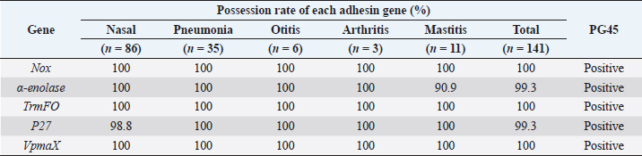 In this study, no relationship was found between the presence of the five adhesins and lesion sites in M. bovis. However, this means that M. bovis isolated from the nasal cavities of asymptomatic cattle have the same numbers and types of adhesins as isolates from symptomatic lesion sites (pneumonia, otitis media, arthritis, and mastitis). Mycoplasma bovis has also been isolated from the deep pharynges of healthy cows (Lima et al., 2016), and it may not cause clinical symptoms as long as it is in the upper respiratory tract (Hananeh et al., 2018). However, it is thought that suppression of the host immune system caused by stress or viral infection results in the rapid growth of pathogenic bacteria in the upper respiratory tract and reduced clearance in the lower respiratory tract, and these pathogenic bacteria reach the lungs (Griffin et al., 2010). After reaching the lung airways, this microorganism causes pneumonia, spreads throughout the body via the bloodstream, and causes various symptoms in infected hosts. This suggests that even M. bovis existing in the nasal cavity of healthy cows may colonize various tissues and result in lesions. The period during which M. bovis exists in the bloodstream in the host is short (Caswell and Archambault, 2007). Nevertheless, during this time, it spreads to various tissues and causes myriad symptoms. This may be due to the abundance of adhesins as shown in this study. In conclusion, we found that M. bovis wild isolates in Japan universally possess nox, α-enolase, trmFO, P27, and vpmaX. The presence of this variety of adhesins may be involved in the pathogenicity and pathology of M. bovis. AcknowledgmentsThe authors would like to thank Drs. Higuchi and Gondaira of Rakuno Gakuen University who provided some M. bovis wild isolates. Conflict of interestThe authors declare that there is no conflict of interest. Author contributionsConceptualization, F. Shitamori, T. Kanda, and R. Uemura; methodology, F. Shitamori and T. Kanda; validation, F. Shitamori and R. Uemura; investigation, F. Shitamori and T. Kanda; resources, R. Uemura; writing—original draft preparation, F. Shitamori; writing—review and editing, F. Shitamori, R. Uemura and M. Sueyoshi; supervision, R. Uemura and M. Sueyoshi; project administration, R. Uemura; funding acquisition, R. Uemura. All authors have read and agreed to the published version of the manuscript. ReferencesBergmann, S., Wild, D., Diekmann, O., Frank, R., Bracht, D., Chhatwal, G.S. and Hammerschmidt, S. 2003. Identification of a novel plasmin (ogen)-binding motif in surface displayed α-enolase of Streptococcus pneumoniae. Mol. Microbiol. 49, 411–423. Bürki, S., Frey, J. and Pilo, P. 2015. Virulence, persistence and dissemination of Mycoplasma bovis. Vet. Microbiol. 179, 15–22. Caswell, J. L. and Archambault, M. 2007. Mycoplasma bovis pneumonia in cattle. Anim. Health Res. Rev. 8, 161–186. Chen, X., Huang, J., Zhu, H., Guo, Y., Khan, F.A., Menghwar, H., Zhao, G. and Guo, A. 2018. P27 (MBOV_RS03440) is a novel fibronectin binding adhesin of Mycoplasma bovis. Int. J. Med. Microbiol. 308, 848–857. Griffin, D., Chengappa, M.M., Kuszak, J. and McVey, D.S. 2010. Bacterial pathogens of the bovine respiratory disease complex. Vet Clin North Am Food Anim Pract. 26, 381–394. Guo, Y., Zhu, H., Wang, J., Huang, J., Khan, F.A., Zhang, J., Guo, A. and Chen, X. 2017. TrmFO, a fibronectin-binding adhesin of Mycoplasma bovis. Int. J. Mol. Sci. 18, 1732. Hananeh, W.M., Momani, W., Ababneh, M.M. and Abutarbush, S.M. 2018. Mycoplasma bovis arthritis and pneumonia in calves in Jordan: An emerging disease. Vet. World. 11, 1663–1668. Higa, Y., Uemura, R., Yamazaki, W., Goto, S., Goto, Y. and Sueyoshi, M. 2016. An improved loop-mediated isothermal amplification assay for the detection of Mycoplasma bovis. J Vet. Med. Sci. 78, 1343–1346. Hotzel, H., Saches, K. and Pfutzner, H. 1996. Rapid detection of Mycoplasma bovis in milk samples and nasal swabs using the polymerase chain reaction. J. Appl. Bacteriol. 80, 505–510. Jones, M.N. and Holt, R.G. 2007. Cloning and characterization of an α-enolase of the oral pathogen Streptococcus mutans that binds human plasminogen. Biochem. Biophys. Res. Commun. 364, 924–929. Kanda, T., Tanaka, S., Suwanruengsri, M., Sukmawinata, E., Uemura, R., Yamaguchi, R. and Sueyoshi, M. 2019. Bovine endocarditis associated with Mycoplasma bovis. J. Comp. Pathol. 171, 53–58. Li, Y., Zheng, H., Liu, Y., Jiang, Y., Xin, J., Chen, W. and Song, Z. 2011. The complete genome sequence of Mycoplasma bovis strain Hubei-1. PLoS One 6, e20999. Lima, S.F., Teixeira, A.G., Higgins, C.H., Lima, F.S. and Bicalho, R.C. 2016. The upper respiratory tract microbiome and its potential role in bovine respiratory disease and otitis media. Sci. Rep. 6, 29050. Maeda, T., Shibahara, T., Kimura, K., Wada, Y., Sato, K., Imada, Y., Ishikawa, Y. and Kadota, K. 2003. Mycoplasma bovis-associated suppurative otitis media and pneumonia in bull calves. J. Comp. Pathol. 129, 100–110. Maunsell, F.P., Woolums, A.R., Francoz, D., Rosenbusch, R.F., Step, D.L., Wilson, D.J. and Janzen, E.D. 2011. Mycoplasma bovis infections in cattle. J. Vet. Intern. Med. 25, 772–783. Qi, J., Guo, A., Cui, P., Chen, Y., Mustafa, R., Ba, X., Hu, C., Bai, Z., Chen, X., Shi, L. and Chen, H. 2012. Comparative geno-plasticity analysis of Mycoplasma bovis HB0801 (Chinese isolate). PLoS One 7, e38239. Sachse, K., Helbig, J.H., Lysnyansky, I., Grajetzki, C., Müller, W., Jacobs, E. and Yogev, D. 2000. Epitope mapping of immunogenic and adhesive structures in repetitive domains of Mycoplasma bovis variable surface lipoproteins. Infect. Immun. 68, 680–687. Song, Z., Li, Y., Liu, Y., Xin, J., Zou, X. and Sun, W. 2012. α-enolase, an adhesion-related factor of Mycoplasma bovis. PLoS One 7, e38836. Wise, K.S., Calcutt, M.J., Foecking, M.F., Röske, K., Madupu, R. and Methé, B.A. 2011. Complete genome sequence of Mycoplasma bovis type strain PG45 (ATCC 25523). Infec