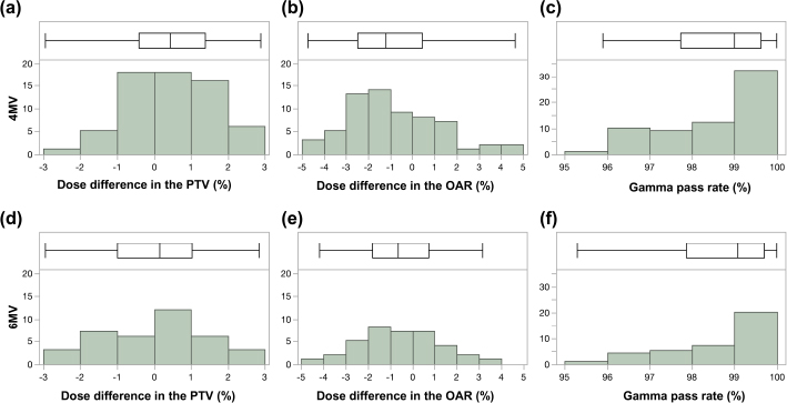 Fig. 1. Box-and-whisker diagram and histogram of error values in PTV, OAR, and gamma pass rate in clinical cases receiving 4-MV and 6-MV IMRT. The results of error values in PTV (a; 4 MV, d; 6 MV), OAR (b; 4 MV, e; 6 MV), and gamma pass rate (c; 4 MV, f; 6 MV). The error values were within 3% for all PTVs (4 MV: median=0.45%; width=−2.96% to 2.88%; 6 MV: median=0.15%, width=−2.96% to 2.83%) and within 5% for all OARs (4 MV: median=−1.22%, width=−4.75 to 4.63%; 6 MV: median=−0.64%, width=−4.18 to 3.14%), and all film-based gamma analysis pass rates were above 95% (4 MV: median=99.00%, width=95.90%–99.98%; 6 MV: median=99.07%, width=95.29%–99.99%; 3 mm/3%, threshold 10%), which allowed us to create a plan within the acceptable range and implement treatment without the need for revalidation. The top of each graph shows a box-and-whisker diagram with the middle line of the box indicating the median value; the left end of the box indicating the first quartile; the right end of the box indicating the third quartile, the left end of the whisker indicating the minimum value; and the right end of the whisker indicating the maximum value. Below each graph is a histogram showing the dose difference (%) or gamma pass rate (%) on the X-axis and the cumulative number of plans on the Y-axis To adjust the MLC parameters in the human medicine, diodes, such as MapCHECK 2, Gafchromic EBT3 film, and ionization chambers were used in the study (Grofsmid et al., 2010; Kinsella et al., 2016; Roche et al., 2018). Dosimetric validation of a commercial AAPM TG-106 proposes the use of films, portal images, or diodes as measurement devices to determine MLC parameters (Das et al., 2008). In veterinary medicine, compared to human medicine, it is economically more difficult to purchase expensive diathermy instruments, and there are associated limitations such as fewer radiation therapists and less manpower. Therefore, it is desirable to verify the results using basic dosimeters and films. In the present study, verification was performed using films and an ionization chamber, and it was thought that verification was possible without using relatively expensive measurement equipment. However, verification using film is difficult because of the storage and handling conditions of the film, the performance of the scanning equipment, and the reproducibility of the analysis. It also has the disadvantages of low initial costs and high running costs. Therefore, it is necessary to consider the balance between these two factors and to find a method that is easy to use. In the present study, it was considered that the gamma analysis path rate worsened, especially in the low-dose range in complicated plans such as those with two or more PTVs, and the absolute dosimetry with PTVs and OARs was within the tolerance limits in all cases. This may be because of the handling of the films. The fact that the verification was performed using films was considered a limitation of this study. Another limitation of this study was that we could not compare the validation results of diode arrays and films. Some veterinary hospitals use a diode array for QA of the plan (Kitagawa et al, 2020); however, it is expensive, and our hospital did not have one. Since it may be clinically easier to perform QA with diode arrays than with film and chamber measurements, information on differences in the QA results of film and diode arrays even in dogs and cats would be useful. A comparison between diodes and films has been reported (Kinsella et al., 2016), and further study is necessary. However, since the purpose of this study was to adjust MLC parameters for veterinary patients, a verification method with films is also recommended, and the fact that diode arrays could not be used was not considered to have a significant impact on this study. The third limitation is that the absolute values of the MLC parameters in this study are considered to be different for each machine, so the MLC parameter needs to be adjusted for each machine. However, the values of the MLC parameters of 4 MV and 6 MV for veterinary clinical patients in this study were considered important information at the beginning of the adjustment process.