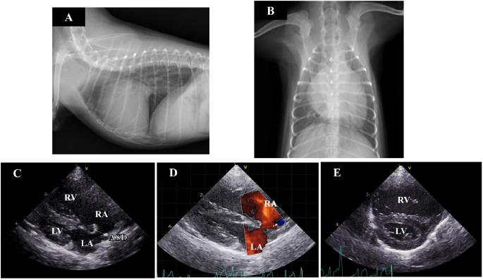 Fig. 1. Thoracic radiography and echocardiography on the first examination. (a) and (b): Thoracic radiography revealed a right-sided cardiomegaly and pulmonary artery enlargement without any abnormality in the respiratory tract. (c)–(e): Echocardiography revealed left-to-right shunting ASD and eccentric and concentric hypertrophy of the right ventricle with ventricular septal flattening. (ASD): atrial septal defect; (LA): left atrium; (LV): left ventricle; (RA): right atrium; (RV): right ventricle. Preanesthetic medications included fentanyl citrate (3 µg/kg IV) and robenacoxib (2 mg/kg SC). The dog was anesthetized with alfaxalone (3 mg/kg IV) and intubated. General anesthesia was maintained with sevoflurane mixed with 100% O2 and infusion of fentanyl citrate at a constant rate (10 µg/kg/h), under controlled ventilation. After intubation, intercostal nerve blocks were performed on the incision area with lidocaine, followed by administration of atropine sulfate (20 µg/kg IM), cefazolin (30 mg/kg IV), and vecuronium bromide (0.05 mg/kg IV). Heart rate, pulse rate, noninvasive arterial blood pressure, electrocardiography tracings, respiratory rate, tidal volume, minute volume, rectal temperature, arterial oxygen saturation, end-tidal carbon dioxide concentration, and sevoflurane concentration were monitored continuously during the surgery. The dog was restrained in the left lateral recumbent position. The right thoracotomy was performed in the fifth intercostal space. After thoracotomy, the pericardium was incised above the phrenic nerve. Dilation of the RA and RV was visually confirmed. The size of the defect was 4.2 mm, as determined through trans right atrial echocardiography with a 12-MHz transducer (Vivid E95, GE Healthcare Japan, Tokyo, Japan). A purse-string ligature (Nescosuture 4-0 taper point, Alfresa Pharma Co. LTD, Osaka, Japan) was formed in the right atrial wall, the atrial wall was punctured with scalpel (No. 11, Akiyama Medical MFG. Co. Ltd., Tokyo, Japan), and catheterization was performed under trans right atrial echocardiographic guidance. The 5 Fr catheter (Destination, Terumo Co. LTD, Tokyo, Japan) was advanced across the atrial defect into the left atrium without guide wire. The first disc and part of the waist (4 mm) (Amplatz canine duct occluder, Infiniti Medical LLC, CA, USA) were deployed in the left atrium. The device was seen to go through the ASD however, so it was exchanged with a different size (waist size 6 mm). The catheter was advanced again, and the device was deployed gently against the atrial septum. While back tension was maintained on the delivery cable, the catheter was retracted such that the second disc was unsheathed within the RA. After deployment, the device was released, the catheter was removed from the atrium, and both the purse-string sutures (Nescosuture 4-0, Alfresa Pharma Co. Ltd., Osaka, Japan) were tied. The thorax was closed in a routine manner, and the drain catheter (8 Fr Atom Multipurpose Tube, Atom Medical Co. LTD, Tokyo, Japan) was placed. The total anesthesia time was 185 minutes, and the operation time was 132 minutes. Recovery from anesthesia was uncomplicated. The dog was administered antibiotics (cefazolin, 30 mg/kg, q 8 hours IV for 3 days, and cefalexin, 15 mg/kg, q 12 hours PO for the next 7 days) after the surgery. Antiplatelet medicine was initiated (aspirin, 0.5 mg/kg, q 24 hours PO for 5 months) after the removal of drain catheter (2 days after surgery). At 2 and 5 days after surgery, red blood cell counts, hematocrit, and hemoglobin content were within the reference ranges and had not noticeably changed compared to their values before surgery. The dog was discharged with instructions to severely limit exercise for 4 weeks and then to limit activity for 3 months. Five days after the operation, dilatation and concentric hypertrophy of the RV, ventricular septal flattening, pulmonary overcirculation, and main pulmonary artery enlargement were improved (pulmonary artery-to-aorta ratio: 1.05) (Fig. 2a–e) although mild residual shunting was observed (Fig. 2d). At 10 months after the operation, the dog had gained weight (1.74 kg), RV enlargement was further improved, and the Qp/Qs had decreased to 1.16. DiscussionThis is the first report of a case in which ASD closure using a hybrid approach was successfully performed in a midget dog breed. We used a method that differed from the previous approaches to similar defects in dogs. Gordon et al. (2009) reported the use of transesophageal echocardiography for transatrial ASD closure in a large dog. Uemura et al. (2018) reported the use of transesophageal echocardiography and computed tomography angiography in a dog weighing 6.7 kg. In the present case, the dog was too small for transesophageal echocardiography (Domenech and Oliveira, 2013), so we used transatrial echocardiography for catheterization. Furthermore, we chose a different intercostal entry from that used in the aforementioned reports : repeated assessment through thoracic radiography and transthoracic echocardiography informed our decision to gain access through the fifth intercostal space. Differences in patient size or the degree of cardiac enlargement may influence this choice in such cases.