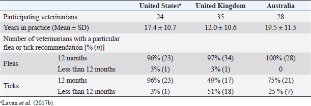 DiscussionThe surveys from the UK and Australia demonstrated that veterinarian opinions regarding flea and tick control are very similar in clinics in all three countries that prescribe fluralaner. In this survey, most veterinarians recommended 12 months of flea control per year. The oral (chew) form of fluralaner is available in all three countries and labeled to protect against fleas for 12 weeks. In the United States, relative to Australia and the UK, the higher proportion of veterinarians recommending 12 months of tick control may reflect the perceived threat of tick-borne disease at the time of the survey. The Paralysis Tick risk in Australia is seasonal and not evenly distributed across the country, and this may alter the perception of tick protection that is required in different regions of that country. UK veterinarians were the least likely to recommend 12 months of tick protection (49% of UK veterinary responders) although UK dog owners were the most likely to report ticks on the dog (34%) versus US (31%) and Australian (18%) dog owners. Fluralaner is available in the US and UK by prescription only but is an over-the-counter medication in Australia. The survey objectives guided the survey design, which created a source of bias. In order to gather dog owner opinions on their experience providing fluralaner to their dogs, dog owners were surveyed in clinics that were currently prescribing the extended duration fluralaner chew at the time that the survey was conducted. All of the survey respondents were currently giving fluralaner chews to their dogs. Clinics were selected because they were currently prescribing fluralaner to canine patients. Pet owners may have used other flea and tick products, but the questions directly targeted their experience with fluralaner. Table 4. Dog owner flea- and tick-control survey questions and responses in the US, UK, and Australia Studies.