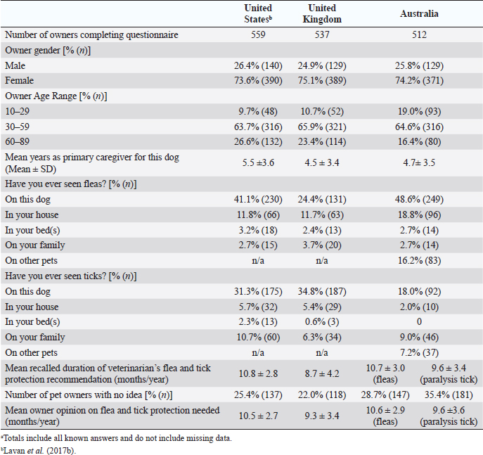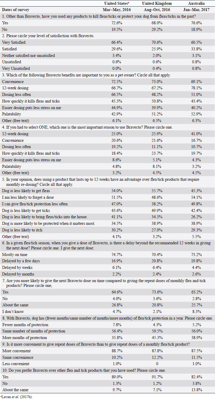AbstractBackground: An extended duration flea and tick medication of the isoxazoline class (fluralaner) was introduced in 2014 in the United States and other countries. A survey was developed in 2016 to gauge dog owner adherence with veterinary recommendations around the administration of preventive flea and tick medications. Current fluralaner-using dog owners were also asked to compare their experience with opinions on monthly flea and tick products. Aim: To survey dog owners who were current users of fluralaner on their opinions, experiences, and attitudes around the administration of flea and tick medications to their dogs in light of current veterinarian recommendations. Methods: Dog owners in the United States (US), United Kingdom (UK), and Australia that gave fluralaner oral chews to their dogs were asked to compare their experience using fluralaner (12-week dosing) and monthly flea and tick medications. The survey responses of dog owners in the UK and Australia were compared against responses to a similar survey conducted in the US in 2017. Surveys were completed by dog owners who were in the clinic for any reason other than a sickness visit. Additionally, veterinarians that prescribed fluralaner from all three countries provided their annual flea and tick treatment recommendation for dogs. Results: A sample of veterinarians from the US, UK, and Australia that prescribe fluralaner recommend that dog owners obtain approximately 12 months of flea protection per year and 9–12 months of tick protection per year. A variable proportion of owners (22%–90%) reported that their dog participates in outdoor and social activities associated with an increased flea and tick exposure risk. A similarly variable proportion of owners reported prior experience of finding fleas (24%–50%) or ticks (18%–35%) on their dogs. All participating owners treated their dogs currently with fluralaner and most (68%–77%) had previously treated their dog with monthly flea and tick products. The convenience of 12-week dosing and less frequent dosing were the most frequently identified product qualities associated with their choice of an extended effect flea and tick treatment. Conclusion: Most veterinarians surveyed in this survey recommended year-round use of a flea and tick medication for dogs in the US, UK, and Australia. Dog owners recalled the veterinary recommendation for flea and tick prevention as 8–10 months per year. Most dog owners from the clinics in the US, UK, and Australia had used shorter-acting (monthly) flea/tick medications previously. The majority of those who currently gave fluralaner doses to their dogs were “satisfied” or “very satisfied” with the extended duration flea and tick product. Preference for a 12-week duration medication over monthly re-treatment was also high (82%–92%) in all three countries and was associated with convenience. Keywords: Dogs, Ectoparasites, Fluralaner, Preference, Satisfaction. IntroductionFleas and ticks are common ectoparasites of animals that can cause disease by direct skin irritation and by transmitting pathogens or toxins while blood feeding (Shaw et al., 2001; Chomel, 2011; Yancey et al., 2014; Fisara and Webster, 2015; Lappin, 2018). Treatments are available to remove these parasites from cats and dogs and eliminate the juvenile life stages from homes and properties. In recent years, isoxazoline class ectoparasiticides have become available as an effective systemic treatment for fleas and ticks on cats and dogs (Pfister and Armstrong, 2016). Most ectoparasiticides for dogs and cats, including the isoxazolines, are dosed at a monthly retreatment interval; however, the novel oral isoxazoline fluralaner (Bravecto®, Merck & Co., Inc., Kenilworth, NJ). is uniquely registered for administration to dogs with a 12-week retreatment interval in the US (Food and Drug Administration (FDA), 2014), UK, and Australia against fleas. The label of the oral Bravecto Chews product has a duration claim for ticks that differs from country to country. In the US, the label has a 12-week claim for Ixodes scapularis (black-legged tick), Dermacentor variabilis (American dog tick) and Rhipicephalus sanguineus (brown dog tick) and an 8-week claim for Amblyomma americanum (lone star tick). In the UK, the label has a 12-week claim for Ixodes Ricinus (castor bean tick), Dermacentor reticulatus (ornate dog tick) and Dermacentor variabilis (American dog tick) and an 8-week claim for Rhipicephalus sanguineus (brown dog tick). In Australia, the label has a 16-week claim for Ixodes holocyclus (paralysis tick) and an 8-week claim for Rhipicephalus sanguineous (brown dog tick) and Haemaphysalis longicornis (bush tick). A prior survey demonstrated that pet owner adherence to veterinary recommendations for canine flea and tick protection in the US is limited (Lavan et al., 2017a). Another study showed on average, dog owners purchased approximately 5–6 months of flea and tick protection when using up to a 12-week retreatment interval treatment but purchased 1–2 months less per year when using a flea and tick treatment with a monthly re-dosing interval (Lavan et al., 2018c). Furthermore, the change up to a 12-week retreatment interval had no impact on dog owner adherence to heartworm prophylaxis because US owners purchased an average of just over 7 months of heartworm prophylaxis (Lavan et al., 2018b), regardless of the retreatment interval for concurrent flea and tick control. Among fluralaner-using dog owners, overall satisfaction with and preference for a 12-week flea and tick medication compared to monthly medications was high in the U.S. (Lavan et al., 2017b) but unknown in other countries. An additional two studies were conducted to evaluate the responses of dog owners in the UK and Australia regarding their flea and tick treatment preferences and to compare the results across the three countries. This paper presents the results of this 3-country comparison in flu