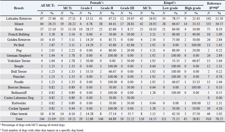 AbstractBackground: Skin tumors are the most frequently diagnosed lesions, of which 7%–21% are mast cell tumors (MCTs). There is a great effort to identify factors that can influence the prospective course of MCTs. Although, the histological grade is considering an important predictor helping to determine the malignancy and metastatic potential of MCTs. Aim: In this study, an epidemiological analysis of risk factors (breed, age, sex, and anatomical site) for dogs having MCTs was evaluated considering the respective MCTs histological grade in comparison to other skin tumors. Methods: The study included 244 dogs affected by cutaneous MCTs from a universe of 1,185 dogs diagnosed with skin tumors. A univariable analysis with Fisher exact test was performed to determine the odds ratios (ORs) with 95% confidence intervals (CIs). Results: Boxers had a higher predisposition to Patnaik’s grade I (OR=5.9, 95% CI 2.648–13.152) and to Kiupel’s low-grade MCTs (OR=2.6, 95% CI 1.539–4.447). Labrador retrievers (OR=2.1, 95% CI 1.423–3.184), and pugs (OR=12.9, 95% CI 2.336–70.931) had a predisposition for Patnaik’s grade II MCTs and Kiupel’s low-grade lesions (OR=2.3, 95% CI 1.478–3.597; OR=17.1, 95% CI 3.093–94.377, respectively). French bulldogs had a higher risk to grade III MCTs (OR=7.9, 95% CI 2.381–26.072). Pit bulls had a predisposition to grade III MCTs and Kiupel’s high-grade tumors (OR=4.4, 95% CI 1.221–16.1 and OR=4.962, 95% CI 1.362–18.077, respectively). Bull terriers (OR=12.7, 95% CI 2.098–76.818) presented higher risk for having low-grade MCTs. The perigenital area and trunk exhibit a greater risk for high grading lesion (OR=6.6, 95% CI 2.679–16.334; OR=1.9, 95% CI 1.028–3.395, respectively) and the limbs had a predisposition to grade II tumor (OR=1.6, 95% CI 1.134–2.395). A decreased risk of having MCT was seen in older dogs (from 7–10 years to 11–18 years) compared to that in the reference group (4–6 years). Conclusion: When comparing to canine skin tumors, this study showed a relationship between MCT histological grading and the risk factors, age, breed, and topography of canine MCTs. The variations noted in the clinical presentation of MCTs amongst predisposed dog breeds reinforces the relevance of the genetic background in MCTs carcinogenesis. Keywords: Dog, Kiupel, Mast cell tumor, Patnaik, Risk. IntroductionOne of the leading causes of mortality in dogs is cancer, accounting from 14% to 27% of all deaths in previous studies (Adams et al., 2010; Dobson, 2013). The quantity of diagnosed tumors is continuously rising since improved health care for pets currently broadens their life expectancy, allowing for the diagnosis of late-in-life diseases, such as cancer (Adams et al., 2010; Villamil et al., 2011; Dobson, 2013; Grüntzig et al., 2015; Śmiech et al., 2017, 2019). One of the most frequently diagnosed tumors are skin tumors, and approximately 7%–21% are mast cell tumors (MCTs) (Welle et al., 2008; Grüntzig et al., 2015). MCTs can be presented as isolated, small, and single case or have a multicentric growth (Blackwood et al., 2012). Plus they can infiltrate the neighboring tissues and metastasize to lymphatic system and internal organs, displaying a wide-ranging clinical course of action (Misdorp, 2004; Murphy et al., 2004; Welle et al., 2008; Blackwood et al., 2012; Śmiech et al., 2018). There is a great effort to identify factors that can influence the prospective course of this disease (Warland and Dobson, 2013; Śmiech et al., 2017, 2018, 2019). One of the most important tumor predictors that can determine its morphological characteristics, metastatic potential, response to treatment as well as prognosis is the histological grade (Zemke et al., 2002; Murphy et al., 2004; Wu et al., 2006; Dobson and Scase, 2007; Romansik et al., 2007; Fröberg et al., 2009; Brønden et al., 2010; Berlato et al., 2012; Costa Poggiani et al., 2012). Prior to 2011, the most commonly used MCTs histological grading system was the three-grade Patnaik system which recognizes three different categories: grade I, II, and III (Patnaik et al., 1984; Śmiech et al., 2017). Grade I are well-differentiated tumors and mostly develop in the dermis and less often in subcutaneous tissue (Śmiech et al., 2017; Tamlin et al., 2020). These tumors do not invade nearby tissues, hardly ever metastasize and generally, after surgical removal with clean margins, they do not recur (Tamlin et al., 2020). They have a predictably good long-term prognosis and a 12-month survival probability up to 100% (Tamlin et al., 2020). Grade II, or intermediate grade tumors, present higher tendency to invade neighboring, extend into the deeper layers of the skin and disseminate to other parts of the body, in comparison to grade I (Tamlin et al., 2020). When these tumors are incompletely surgical removed or with narrow margins, they have more chances to recur. About 87%–92% of these tumors have a 12-month survival probability (Tamlin et al., 2020). Grade III or high grade tumors are poorly differentiated, invade deep into the skin and underlying tissue and are extremely aggressive, presenting a metastasis rate of 55%–95% (Tamlin et al., 2020). Require aggressive therapeutic management since patients detain a poor long-term prognosis and about 16%–46% probability of 12-month survival (Tamlin et al., 2020). Animal outcome with grade II MCTs can be difficult to predict (Sabattini et al., 2015). In some cases, these lesions can behave either as grade I tumors, or more aggressively, as grade III (Garrett, 2014; Sabattini et al., 2015). An additional challenge is the trustworthiness of the grade evaluated and attributed by the pathologist since there is some degree of subjectivity within this system (Sabattini et al., 2015) . As a result of these challenges related with behavior variability and unpredictable clinical course, Kiupel et al. (2011) proposed a new 2-grade classification system di