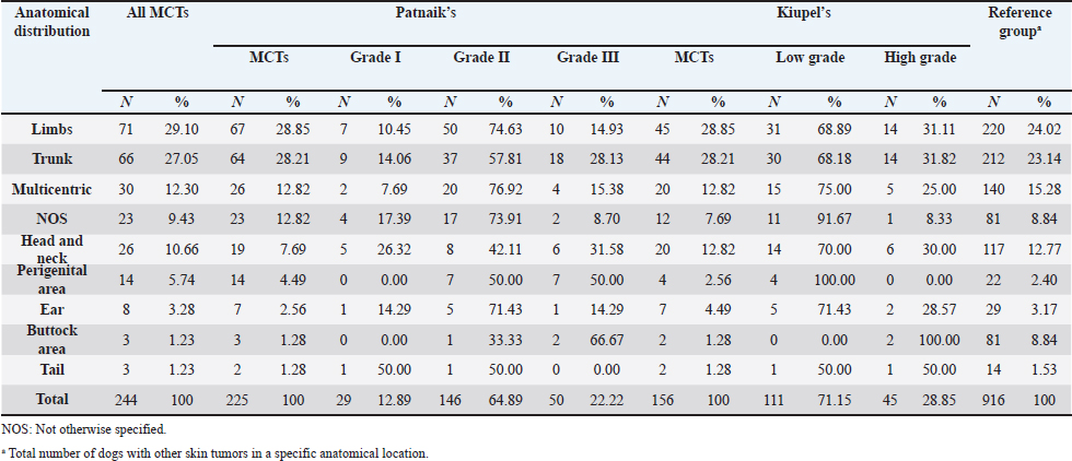 Table 4. Frequency of MCTs in general and according to Patnaik’s classification systems and Kiupel’s classification system by tumor location.