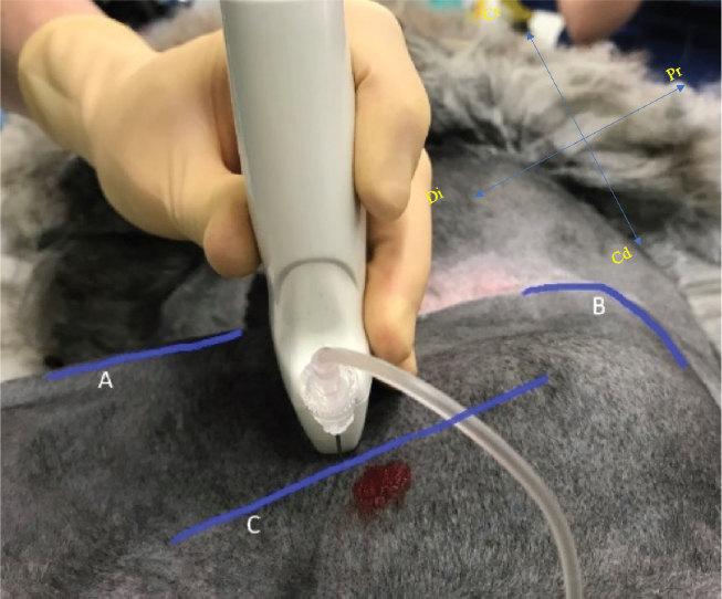 Fig. 1. Position of ultrasound transducer and needle performing the sciatic nerve block, identifying the cranial border of the limb (A), the wing of the ileum (B) and the orientation of the femur (C). Case 2A 5-year old male entire Suri Alpaca ( V. pacos) weighing 80 kg was referred to the Royal Veterinary College for a left hind lateral claw removal, following a previous diagnosis of squamous cell carcinoma of the claw . Pre-anesthetic examination was considered unremarkable. The patient was starved, a jugular catheter placed and premedication performed as for case 1. The induction was performed 10 minutes later, with 3 mg/kg ketamine (Ketamidor ®100 mg/ml , Chanelle Pharma Group, Loughrea, Ireland) IV followed by intubation with a 12 mm ID cuffed endotracheal tube. The patient was connected to a circle rebreathing system and anesthesia was maintained with isoflurane in oxygen and air (0.8 and 0.2 , respectively). Hartmann’s solution was infused at 2 ml/kg/hour. The animal was monitored as described in case 1 except for BP, which was measured invasively via a 20 g IV catheter placed in the right auricular artery . Mechanical ventilation was initiated immediately following the start of volatile anesthesia, with tidal volume and respiratory rate adjusted to maintain normocapnia. The SN block was performed as described in case 1, using 0.1 ml/kg (0.75 mg/kg) of ropivacaine (Naropin ®0.75%, AstraZeneca, Cambridge, UK). The patient was transferred to the surgical theatre where claw amputation was performed . General anesthesia lasted 1 hour and 40 minutes. During this time, the patient experienced mild hypotension with a mean arterial pressure of 60 mmHg. An IV bolus of 0.1 mg/kg ephedrine (Ephedrine Hydrochloride, Martindale Pharmaceuticals, Buckinghamshire, UK) was given, increasing mean BP to ~95mmHg. Further vasopressor administration was not required. No changes in HR, BP, or RR (suggestive of either sympathetic stimulation or nociception) were observed. The ETiso concentration ranged from 0.87% to 1.3% throughout.