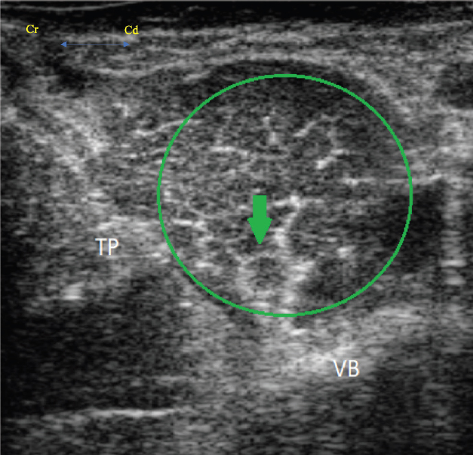 Fig. 4. Transverse ultrasound image showing the iliopsoas muscle (green circle), the femoral nerve (green arrow), the vertebral body (VB) and the transverse process (TP). The femoral nerve appears as a rounded hypoechoic structure with a thin hyperechoic rim. Ropivacaine 0.75% was the LA of choice for these cases. The authors made this decision based on clinical experience and the favorable pharmacological profile of the drug. Indeed, ropivacaine has a lower tendency to produce both motor block (Simpson et al., 2005) and cardiovascular or neurologic toxicity compared to other LAs, while it can still be considered a longer acting LA, like bupivacaine (Feldman et al., 1989) . It is worth mentioning that different techniques could have been used to provide similar effects for these cases . The first alternative to PNBs is the use of epidural anesthesia, something that has been reported for procedures of the proximal hind limb of the alpaca (Tee et al., 2005; Garcia Pereira et al., 2006; Abrahamsen, 2009). The decision was made not to use this technique for these cases , as in both situations recovery from anesthesia with rapid ambulation was deemed to be in the animals’ best interests . An alternative PNB that could have been utilized is the FN block, at the level of the femoral triangle that has previously been investigated in farm animals (Adami et al., 2011; Viscasillas et al., 2015). Further options such as a ring block or a Bier block (Valverde and Sinclair , 2015), commonly used for procedures of the distal limb in farm animals, were considered for the second case. However, the authors concluded that lack of data illustrating the toxic dose of LAs in alpacas was a significant limitation to performing a Bier block. Second, placing an IV catheter in the distal limb of an alpaca can be extremely challenging (Plummer et al., 2013). This report presents a few limitations worthy of discussion. First, the authors were unable to visualize the ON in the alpaca undergoing mid-femur amputation. Therefore, the advantages associated with block of the ON are considered speculation only with regards to this case. Changes in HR, BP, and/or RR were utilized for the identification of nociception under general anesthesia. This is in accordance to a previous investigation (Adami et al., 2011) in which a deviation of 10%, 25%, and 50% in HR, mean arterial pressure (MAP), and RR respectively, from the recorded baseline were considered suggestive of nociception. Based on our observations, one may assume that adequate analgesia had been achieved. However, physiological parameters can be influenced by a number of other factors including stress, disease status, and behavior of the animal Gleerup and Lindegaard, 2016. Furthermore, the assessment of analgesia and nociception under general anesthesia were evaluated in the presence of concurrently administered systemic analgesics. Buprenorphine was given IV prior to surgery in both of these animals. Based on the experience of the authors and on published pharmacokinetics, buprenorphine is unlikely to result in adequate analgesia alone for either of the procedures performed. Indeed, due to the rapid clearance and short half-life (Dooley et al., 2017), buprenorphine may require frequent re-dosing to provide analgesia. It is, therefore, unlikely that buprenorphine resulted in prolonged analgesia for the entire intraoperative period for this case. This is also true for the ketamine administered; use of ketamine as an induction agent will also have provided analgesia in both cases, however, due to the length of the surgical procedures it was deemed at least unlikely to have played an ongoing analgesic role (Anderson, 2013). Importantly, difficulty exists in pain assessment of these animals as there are no validated pain scales for this species. Pain detection and quantification is mainly dependent on the ability of the investigator to detect behavio ral changes, as for many prey animal species. In the immediate post-operative period, pain was evaluated hourly by either anesthetist or an expert farm animal clinician and was considered well controlled. With all of this information considered, both SN and PsC blocks may be considered effective adjuncts to systemic analgesia for this species. In conclusion, this case report highlights the potential value of both ultrasound guided SN and PsC blocks for alpacas undergoing painful hind limb procedures , to achieve multimodal analgesia. Limitations to performing and accurately assessing their effectiveness still exist. With better understanding of the anatomy and through the creation of a validated pain scoring system , the possibility of species-specific loco-regional technique development exists . Conflicts of interestThe authors declare that there is no conflict of interest. Author’s contributionAndrew Foster and Paolo Monticelli were the anaesthetists in charge of the cases. Alex McSloy was the primary clinician of the cases and carried out their clinical assessments. All the authors contributed, largely, to the writing and revision of this manuscript. ReferencesAbrahams, M .S., Aziz, M.F., Fu, R.F. and Horn, J .L. 2009. Ultrasound guidance compared with electrical neurostimulation for peripheral nerve block: a systematic review and meta-analysis of randomized controlled trials. Br. J. Anaesth. 102, 408–417. Abrahamsen, E.J. 2009. Chemical restraint, anesthesia and analgesia for Camelids. Vet. Clin. North Am. Food Anim. Pract. 25, 455 –494. Adami, C., Bergadano, A., Bruckmaier, R.M., Stoffel, M .H., Doherr, M.G., and Spadavecchia, C. 2011. Sciatic-femoral nerve block with bupivacaine in goats undergoing elective stifle arthrotomy . Vet. J. 188, 53–57. Aguiar, J., Mogridge, G. and Hall, J. 2014. Femoral fracture repair and sciatic and femoral nerve blocks in a guinea pig. J. Small Anim. Pract. 55(12), 635–639. Anderson, D.E. 2013. Behaviour and capture techniques. In Veterinary techniques for Llamas and Alpaca, 
