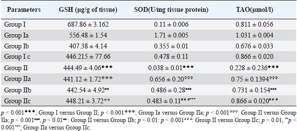 Fig. 1. Effect of CUS on MDA level of the hippocampus in control groups and experimental groups. p < 0.001♦♦♦; Group I versus Group II; p < 0.001✞✞✞: Group II versus Group IIa; p < 0.001♠♠♠: Group II versus Group IIb; p < 0.001# # #: Group II versus Group IIc; p < 0.001***; Group IIa versus Group IIc. Table 1. Effect of CUS on biochemical parameters of the hippocampus in control groups and experimental group.