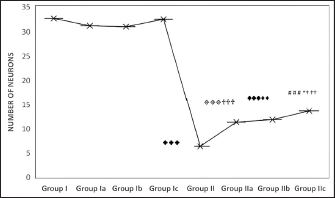 Fig. 3. Effect of CUS on the neuronal count in the frontal cortex in the control group and experimental groups. p < 0.001♦♦♦; Group I versus Group II; ◈◈◈; Group Ia versus Group IIa; p < 0.001✞✞✞: Group II versus Group IIa; p < 0.001♠♠♠: Group II versus Group IIb; p < 0.001# # #: Group II versus Group IIc; p < 0.001***; Group IIa versus Group IIc; † † † Group Ic versus Group IIc.