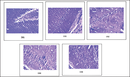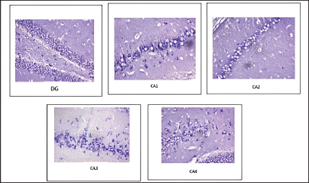 Fig. 6. Distribution of neuronal count in different regions of the hippocampus in CUS-induced cod liver oil treated group (Group IIb). Table 2. Effect of CUS on neuronal count on various regions of hippocampus in control groups and experimental groups.