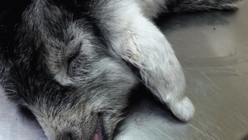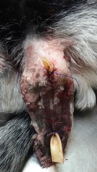 Fig. 3. The left ear pinna of the goat kid of Figure 1 after drainage of the aural hematoma with a Penrose tube. Two months after surgery, the kid was re-evaluated. It was observed that the left pinna had complete hair coverage without any malformations except from two small scars at the incision sites (Fig. 5). The right pinna was healed completely and the tip was covered by scar tissue (Fig. 6). According to the farmer, the recovery was uneventful; the drain was removed after 5 days, and the right pinna was healed within approximately 3 weeks. Written informed consent for the publication of the clinical details and images of this case was obtained from the farmer. DiscussionAuricular hematomas and necrosis of the ear pinna are rare in small newborn ruminants in clinical practice. To the authors’ knowledge, there is no relevant reference in the available literature. According to the farmer, this condition was caused due to biting from adult goats; the observed skin necrosis of the right pinna and the necrosis of the epidermis of the left one are both consistent with such traumas.